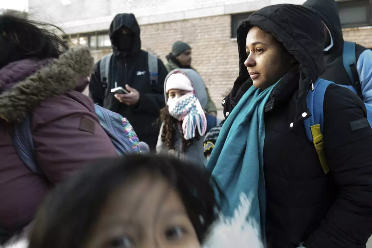 Gleydis Carvajal waits in line with her children to board a bus after picking up his children from their school in the Flatbush neighborhood of Brooklyn and commuting with them to a shelter in the Jamaica neighborhood of the Queens borough of New York, Tuesday, Jan. 14, 2025. Carvajal and her family were recently relocated to a migrant shelter in Queens after the family shelter at Floyd Bennett Field was closed. (AP Photo/Klaus Galiano)