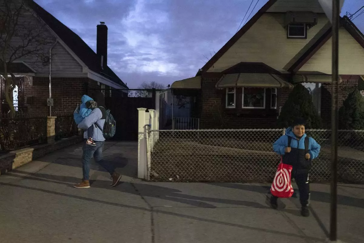 Gabriel Montilla carries his son from a bus stop to a migrant shelter in Queens after picking them up from school in Brooklyn, in New York, Tuesday, Jan. 14, 2025. Montilla and his family were recently relocated to a migrant shelter in Queens after the family shelter at Floyd Bennett Field was closed. (AP Photo/Klaus Galiano)