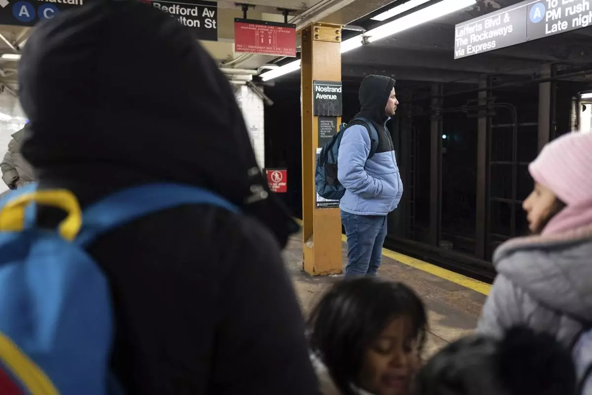 Gabriel Montilla waits for a train after picking up his children from their school in the Flatbush neighborhood of Brooklyn and commuting with them to a shelter in the Jamaica neighborhood of the Queens borough of New York, Tuesday, Jan. 14, 2025. Montilla and his family were recently relocated to a migrant shelter in Queens after the family shelter at Floyd Bennett Field was closed. (AP Photo/Klaus Galiano)