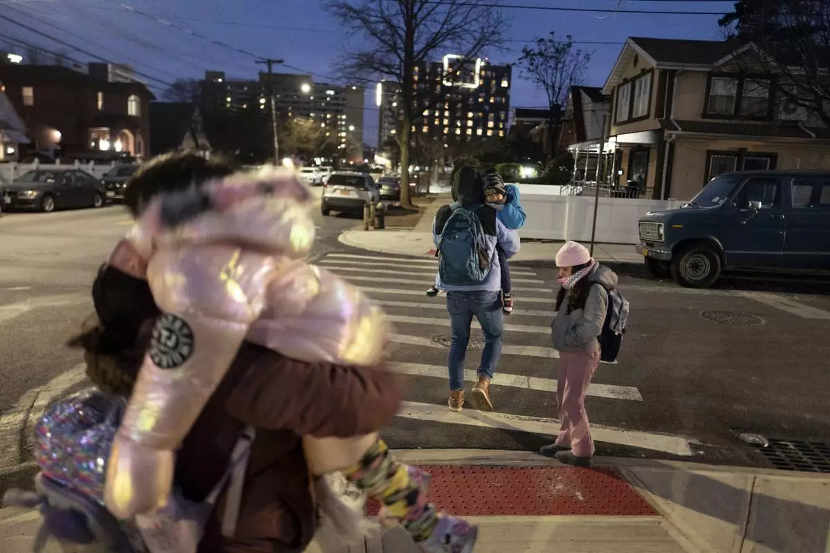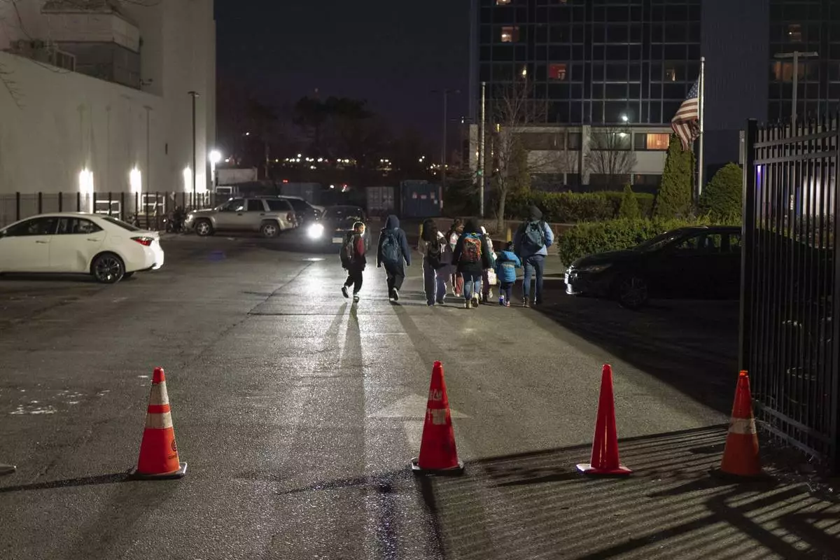 Gleydis Carvajal, and her husband, Gabriel Montilla, walk with their children from a bus stop to a migrant shelter in Queens after picking them up from school in Brooklyn, New York, Tuesday, Jan. 14, 2025. Carvajal and her family were recently relocated to a migrant shelter in Queens after the family shelter at Floyd Bennett Field was closed. (AP Photo/Klaus Galiano)