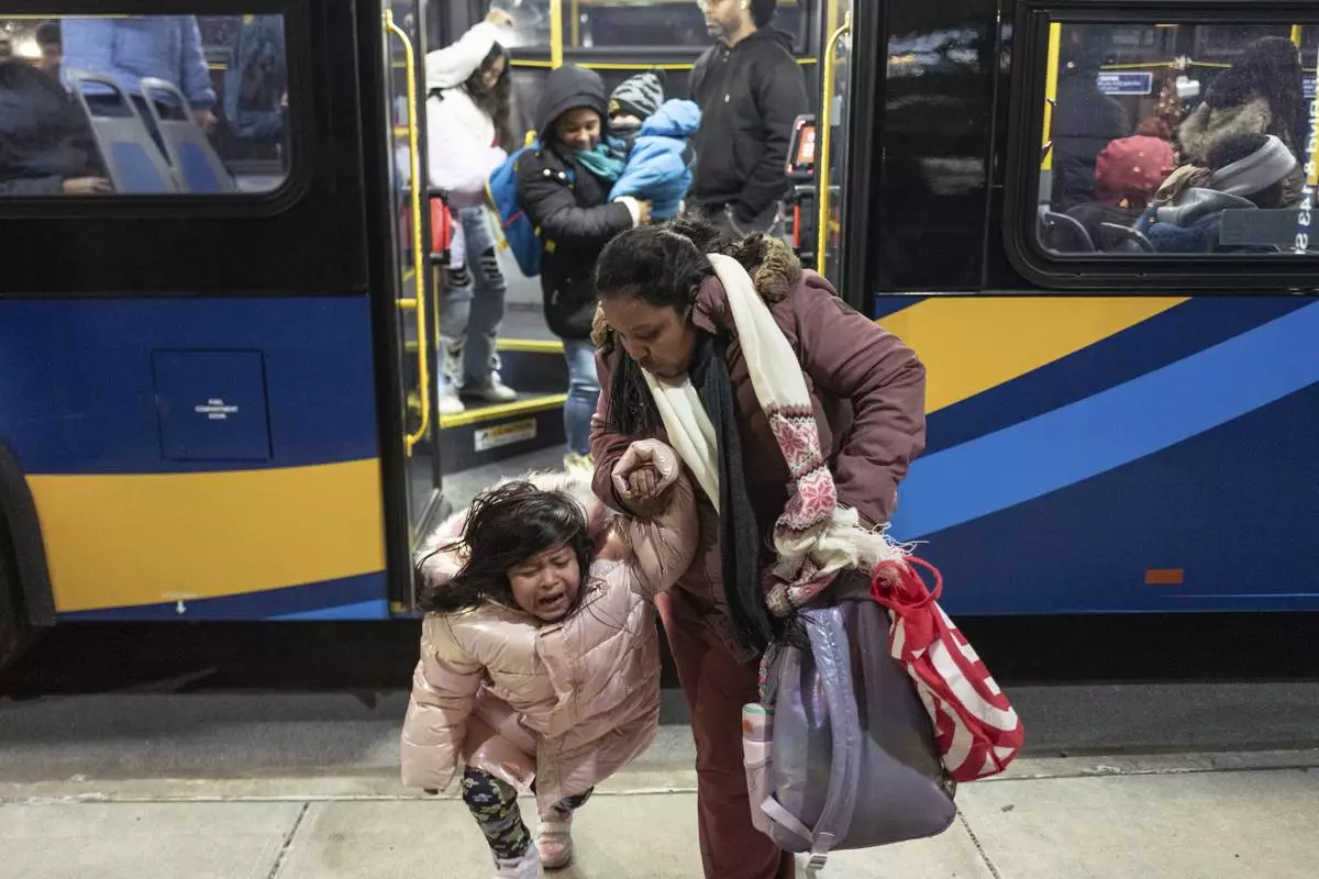 Ecuadorian Leidy Andrade consoles her daughter as they alight from a bus during their commute from Brooklyn to the Queens borough of New York, Tuesday, Jan. 14, 2025. Andrade and her family were recently relocated to the shelter in Queens after the family shelter at Floyd Bennett Field was closed. (AP Photo/Klaus Galiano)