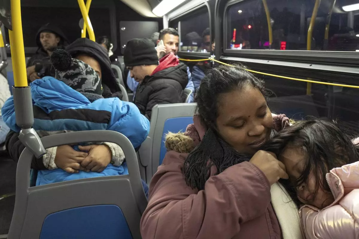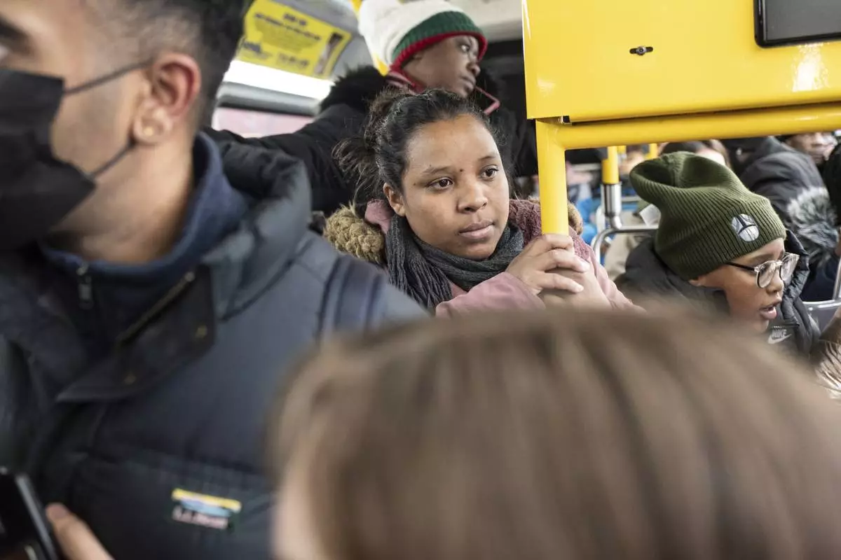 Ecuadorian Leidy Andrade rides a bus after picking up her children from their school in the Flatbush neighborhood of Brooklyn and commuting with them to a shelter in the Jamaica neighborhood of the Queens borough of New York, Tuesday, Jan. 14, 2025. Andrade and her family were recently relocated to a migrant shelter in Queens after the family shelter at Floyd Bennett Field was closed. (AP Photo/Klaus Galiano)