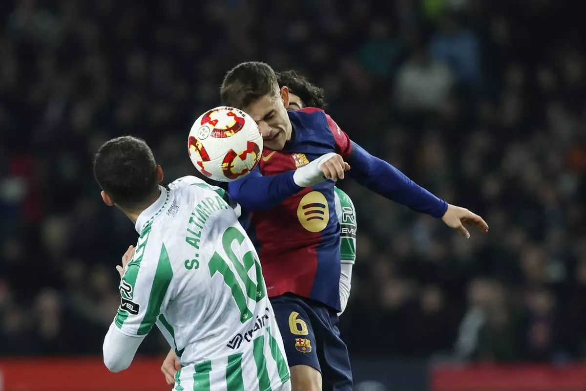 Barcelona's Gavi, right, jumps for the ball with Betis' Sergi Altimira during a Spanish Copa del Rey round of 16 soccer match between Barcelona and Real Betis at the Lluis Companys Olympic Stadium in Barcelona, Spain, Wednesday, Jan. 15, 2025. (AP Photo/Joan Monfort)