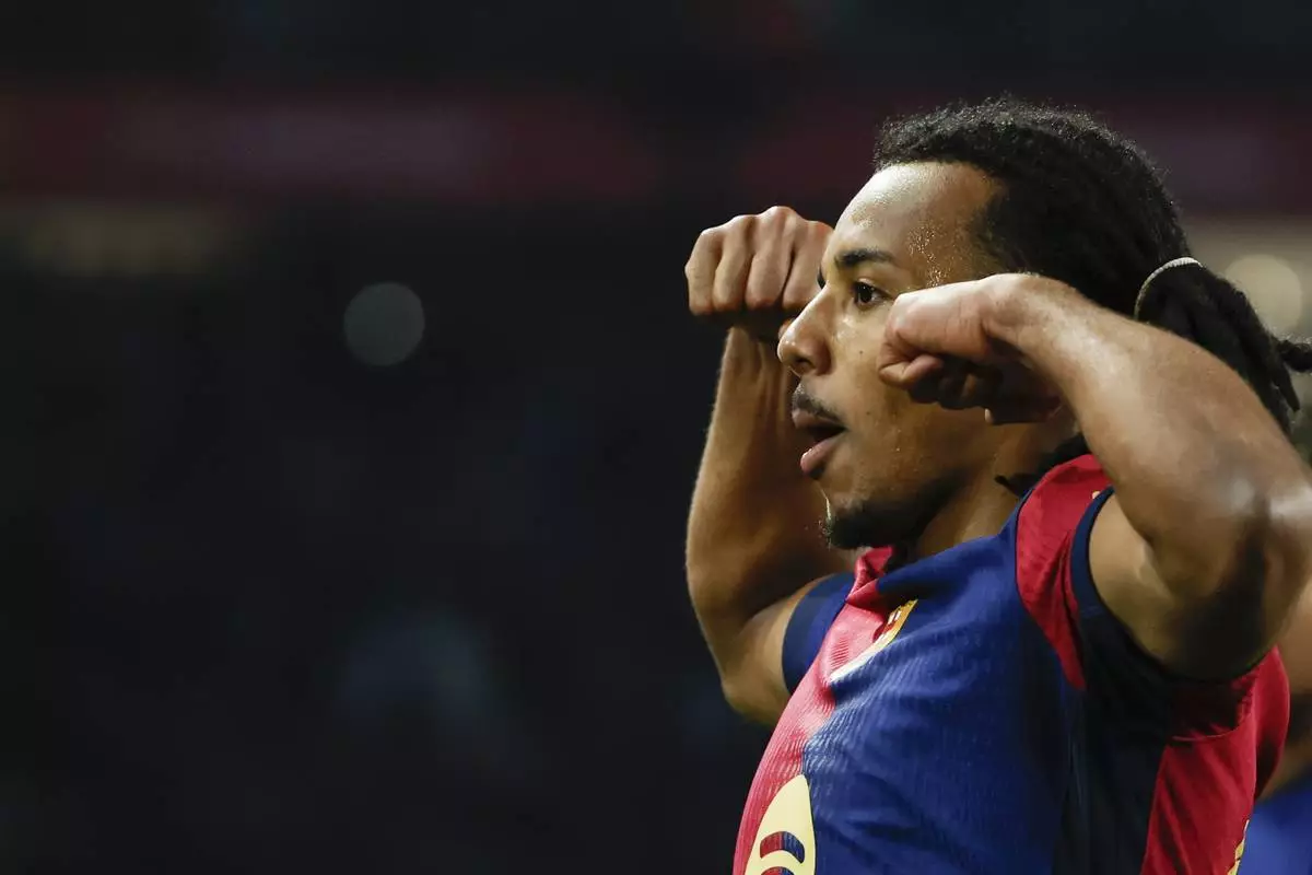 Barcelona's Jules Kounde celebrates after scoring his side's opening goal during a Spanish Copa del Rey round of 16 soccer match between Barcelona and Real Betis at the Lluis Companys Olympic Stadium in Barcelona, Spain, Wednesday, Jan. 15, 2025. (AP Photo/Joan Monfort)