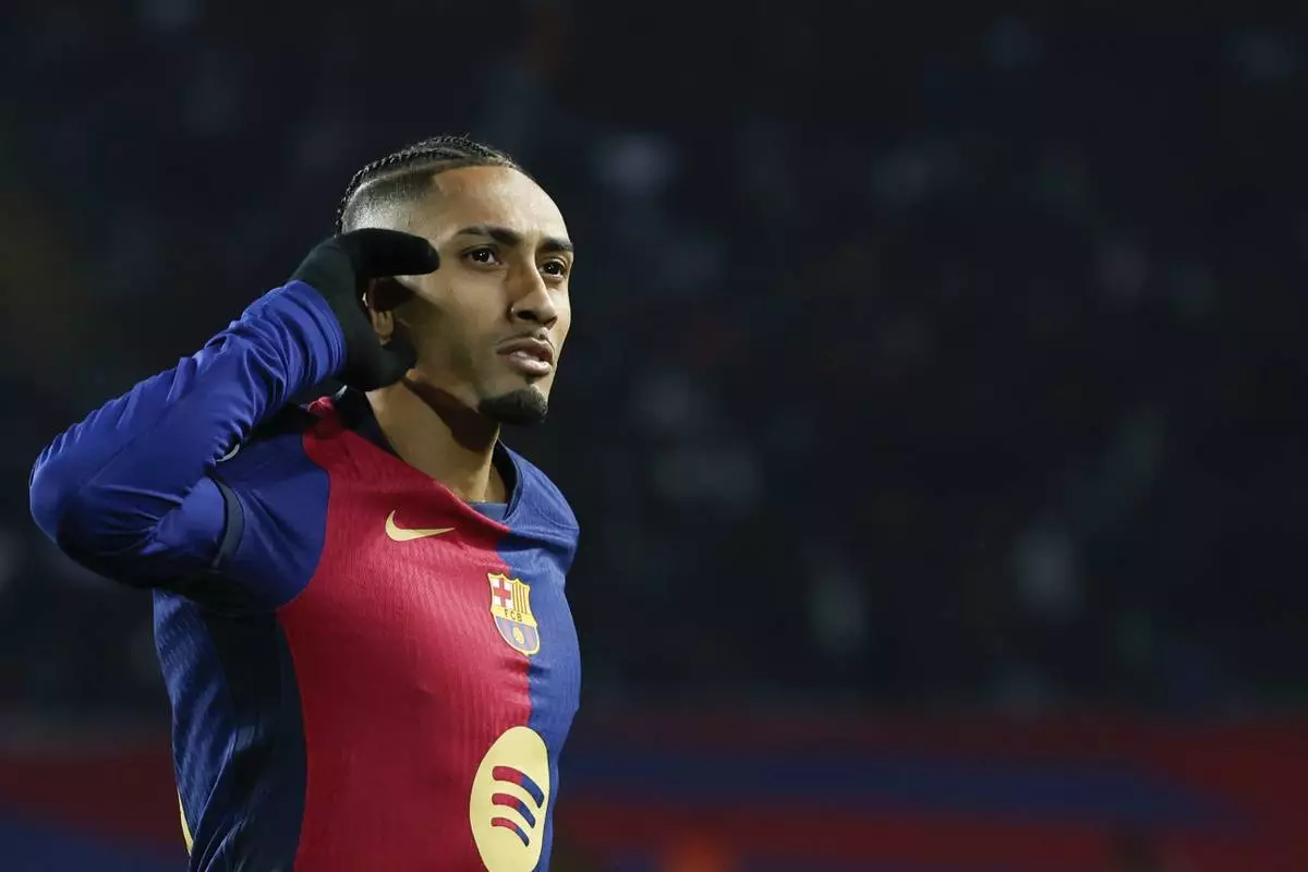 Barcelona's Raphinha celebrates after scoring his side's third goal during a Spanish Copa del Rey round of 16 soccer match between Barcelona and Real Betis at the Lluis Companys Olympic Stadium in Barcelona, Spain, Wednesday, Jan. 15, 2025. (AP Photo/Joan Monfort)