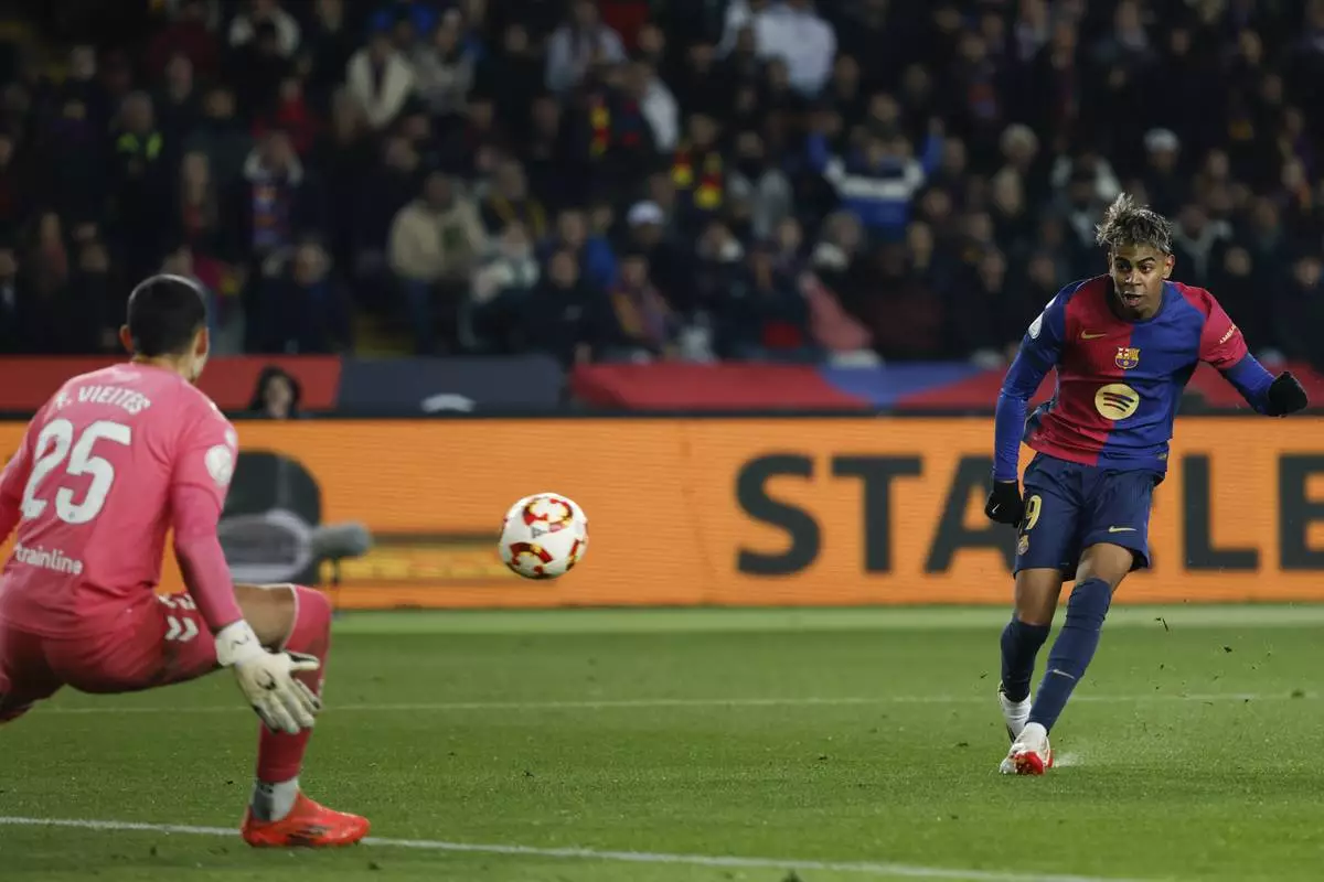 Barcelona's Lamine Yamal, right, scores his side's fifth goal during a Spanish Copa del Rey round of 16 soccer match between Barcelona and Real Betis at the Lluis Companys Olympic Stadium in Barcelona, Spain, Wednesday, Jan. 15, 2025. (AP Photo/Joan Monfort)