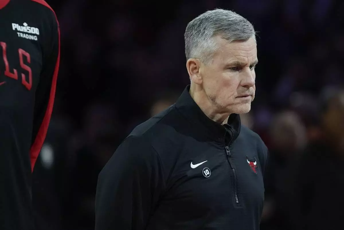 Chicago Bulls head coach Billy Donovan stands for the Star-Spangled Banner before an NBA basketball game against the Atlanta Hawks, Wednesday, Jan. 15, 2025, in Chicago. (AP Photo/Erin Hooley)