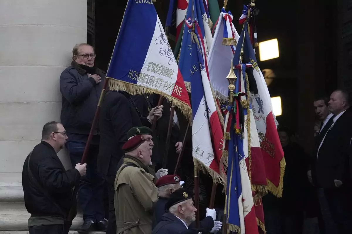 Veterans hold flags at the entrance of Notre Dame du Val-de-Grace church during a public memorial for late far-right leader Jean-Marie Le Pen, Thursday, Jan. 16, 2025 in Paris. Jean-Marie Le Pen, the founder of France's main far-right party, died on Jan.7, 2025 aged 96. (AP Photo/Michel Euler)