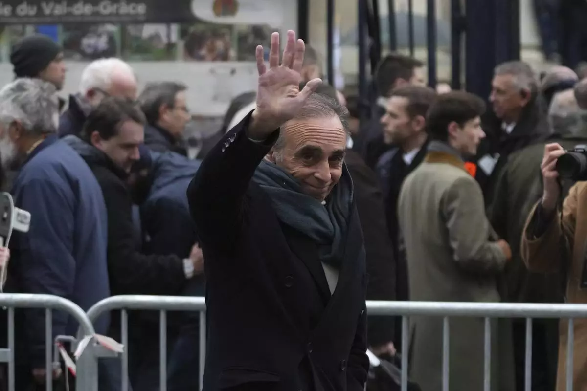 Eric Zemmour, founder of far-right party Reconquete (Renew), waves as he arrives at Notre Dame du Val-de-Grace church before a public memorial for late far-right leader Jean-Marie Le Pen, Thursday, Jan. 16, 2025 in Paris. Jean-Marie Le Pen, the founder of France's main far-right party, died on Jan.7, 2025 aged 96. (AP Photo/Thibault Camus)