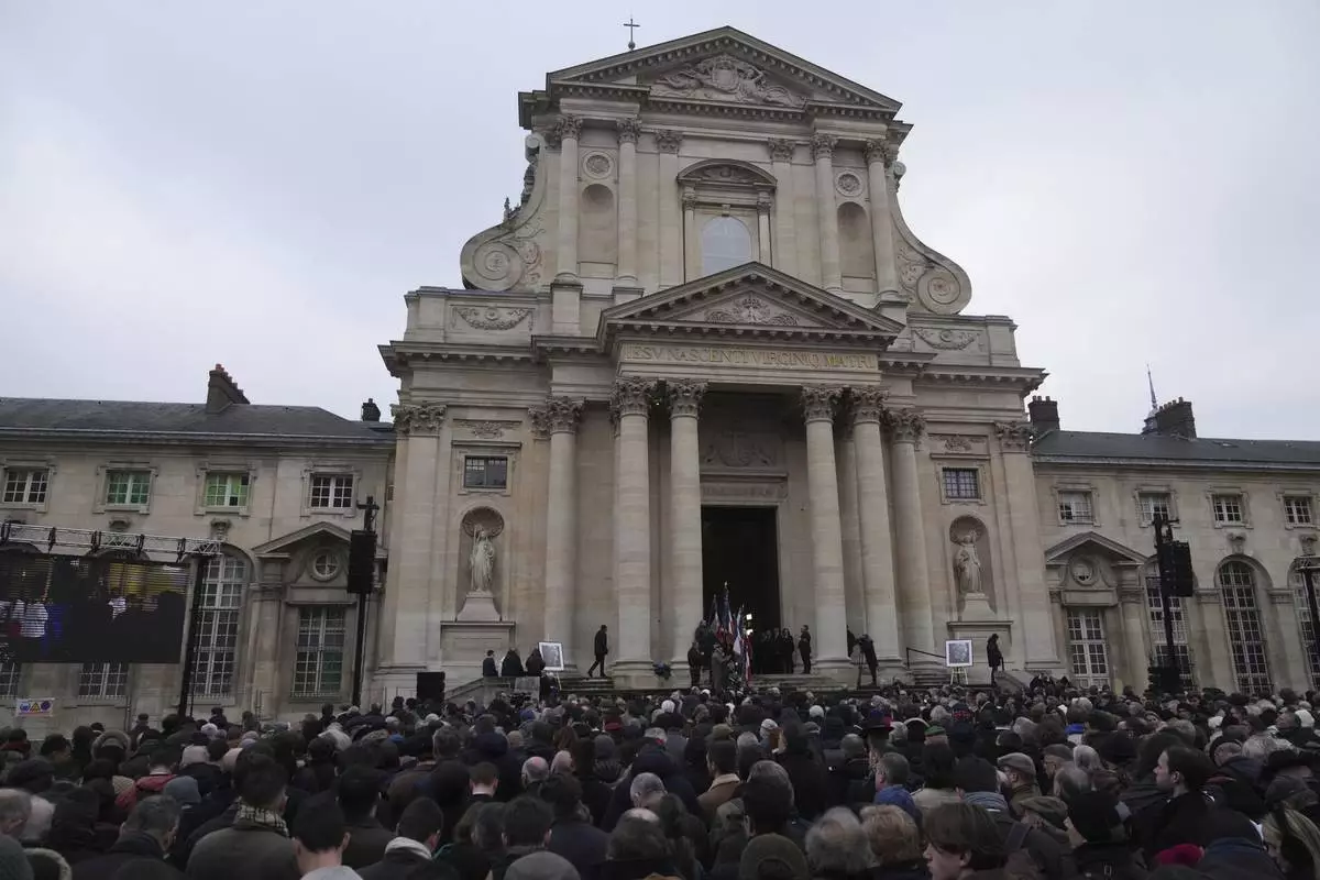 People gather outside Notre Dame du Val-de-Grace church during a public memorial for late far-right leader Jean-Marie Le Pen, Thursday, Jan. 16, 2025 in Paris. Jean-Marie Le Pen, the founder of France's main far-right party, died on Jan.7, 2025 aged 96. (AP Photo/Michel Euler)