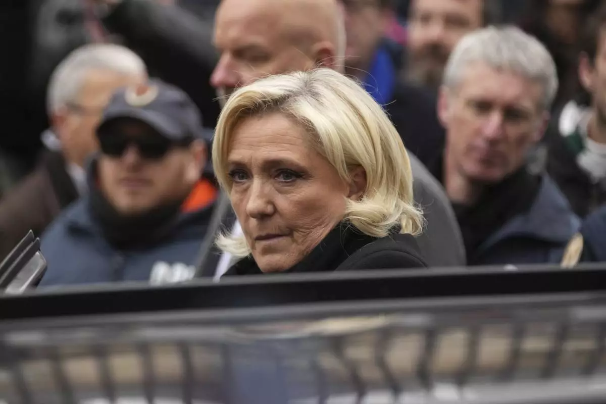 French far-right leader Marine Le Pen arrives Notre Dame du Val-de-Grace church for a public memorial for her father and late far-right leader Jean-Marie Le Pen, Thursday, Jan. 16, 2025 in Paris. Jean-Marie Le Pen, the founder of France's main far-right party, died on Jan.7, 2025 aged 96. (AP Photo/Thibault Camus)