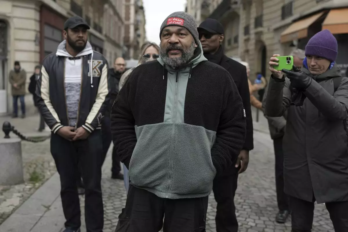 Dieudonne M'Bala M'Bala, a French comedian repeatedly convicted of inciting antisemitism or racial hatred, stays outside Notre Dame du Val-de-Grace church during a public memorial for late far-right leader Jean-Marie Le Pen, Thursday, Jan. 16, 2025 in Paris. Jean-Marie Le Pen, the founder of France's main far-right party, died on Jan.7, 2025 aged 96. (AP Photo/Thibault Camus)