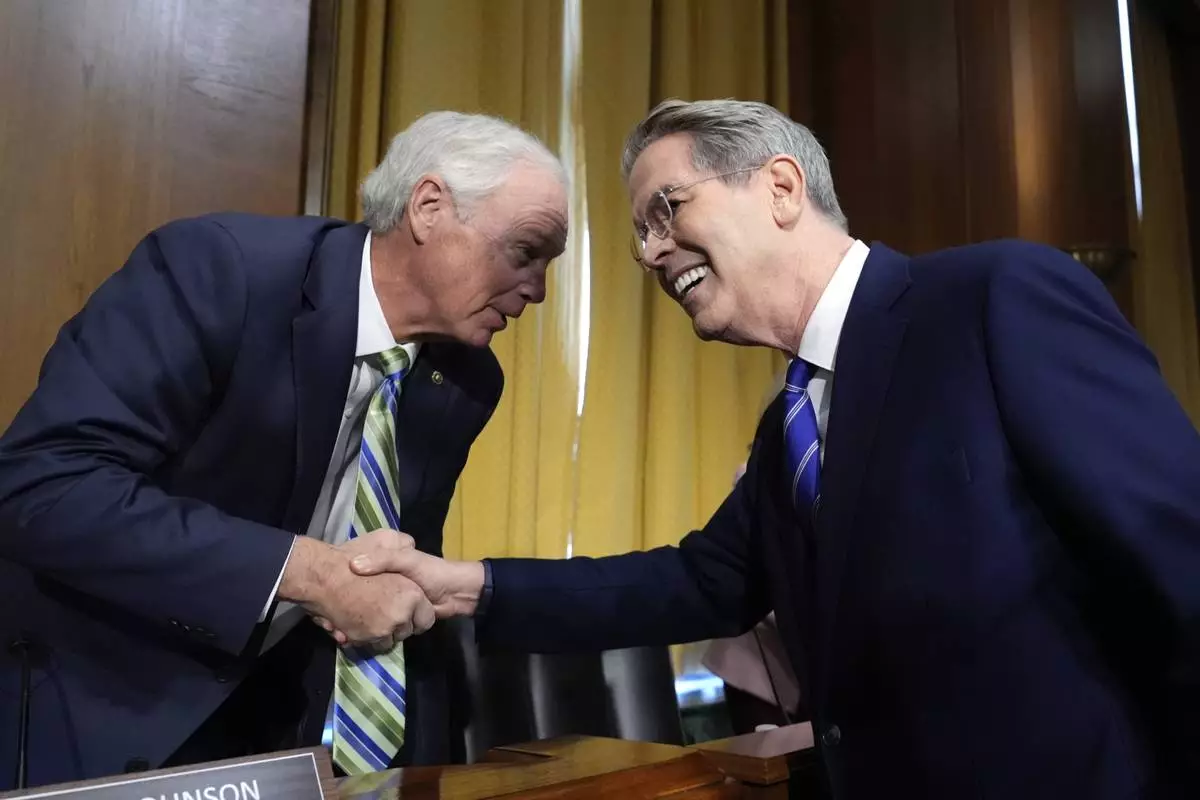 Sen. Ron Johnson, R-Wis., left, greets Scott Bessent, right, President-elect Donald Trump's choice to be secretary of the Treasury, before the Senate Finance Committee for Bessent's confirmation hearing, at the Capitol in Washington, Thursday, Jan. 16, 2025. (AP Photo/J. Scott Applewhite)
