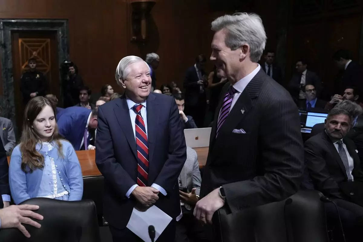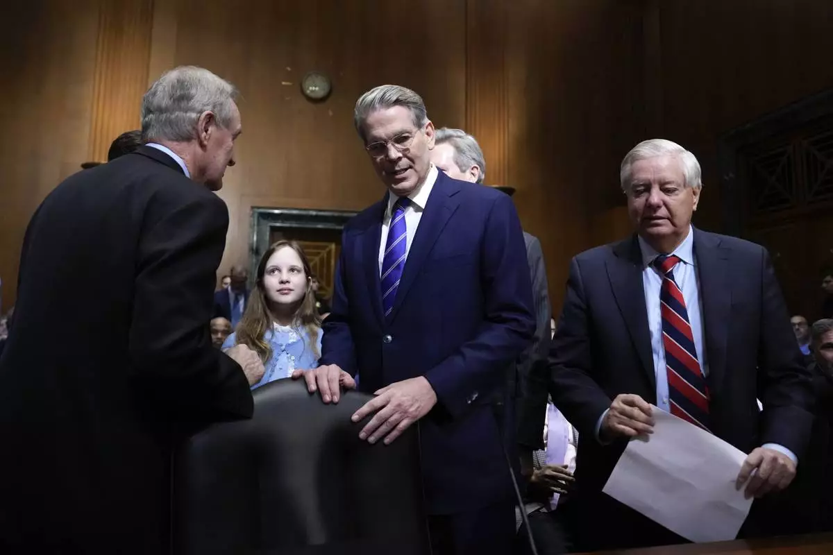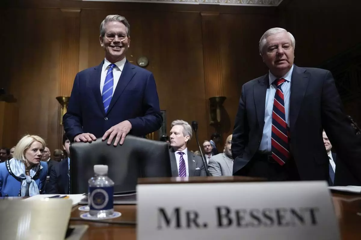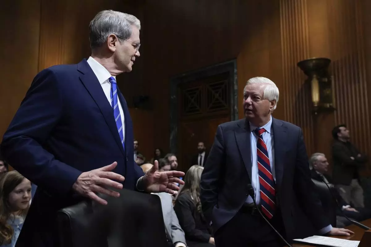 Sen. Lindsey Graham, R-S.C., introduces Scott Bessent, President-elect Donald Trump's choice to be Secretary of the Treasury, appears before the Senate Finance Committee for his confirmation hearing, at the Capitol in Washington, Thursday, Jan. 16, 2025. (AP Photo/Ben Curtis)