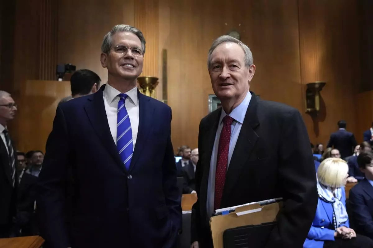 Scott Bessent, left, President-elect Donald Trump's choice to be Secretary of the Treasury, arrives with Sen. Lindsey Graham, R-S.C., right, before the Senate Finance Committee for his confirmation hearing, at the Capitol in Washington, Thursday, Jan. 16, 2025. (AP Photo/J. Scott Applewhite)