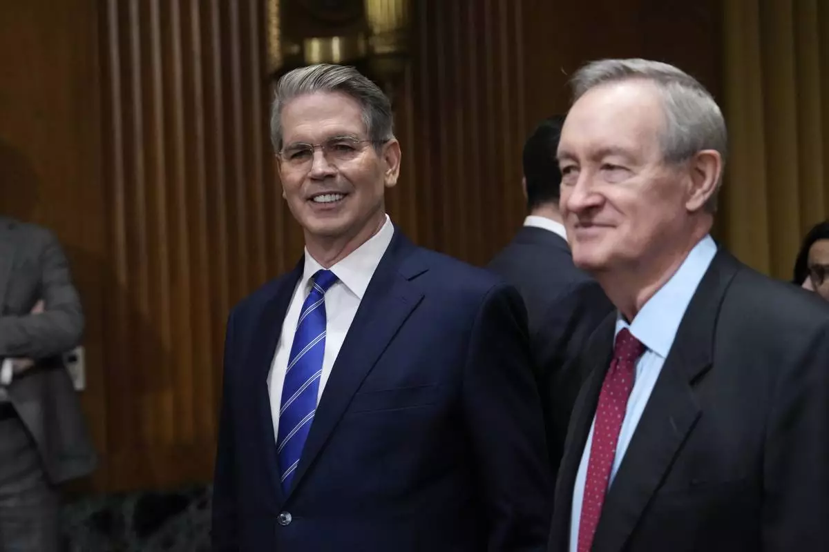 Scott Bessent, center, President-elect Donald Trump's choice to be Secretary of the Treasury, arrives before the Senate Finance Committee for his confirmation hearing, at the Capitol in Washington, Thursday, Jan. 16, 2025. (AP Photo/Ben Curtis)