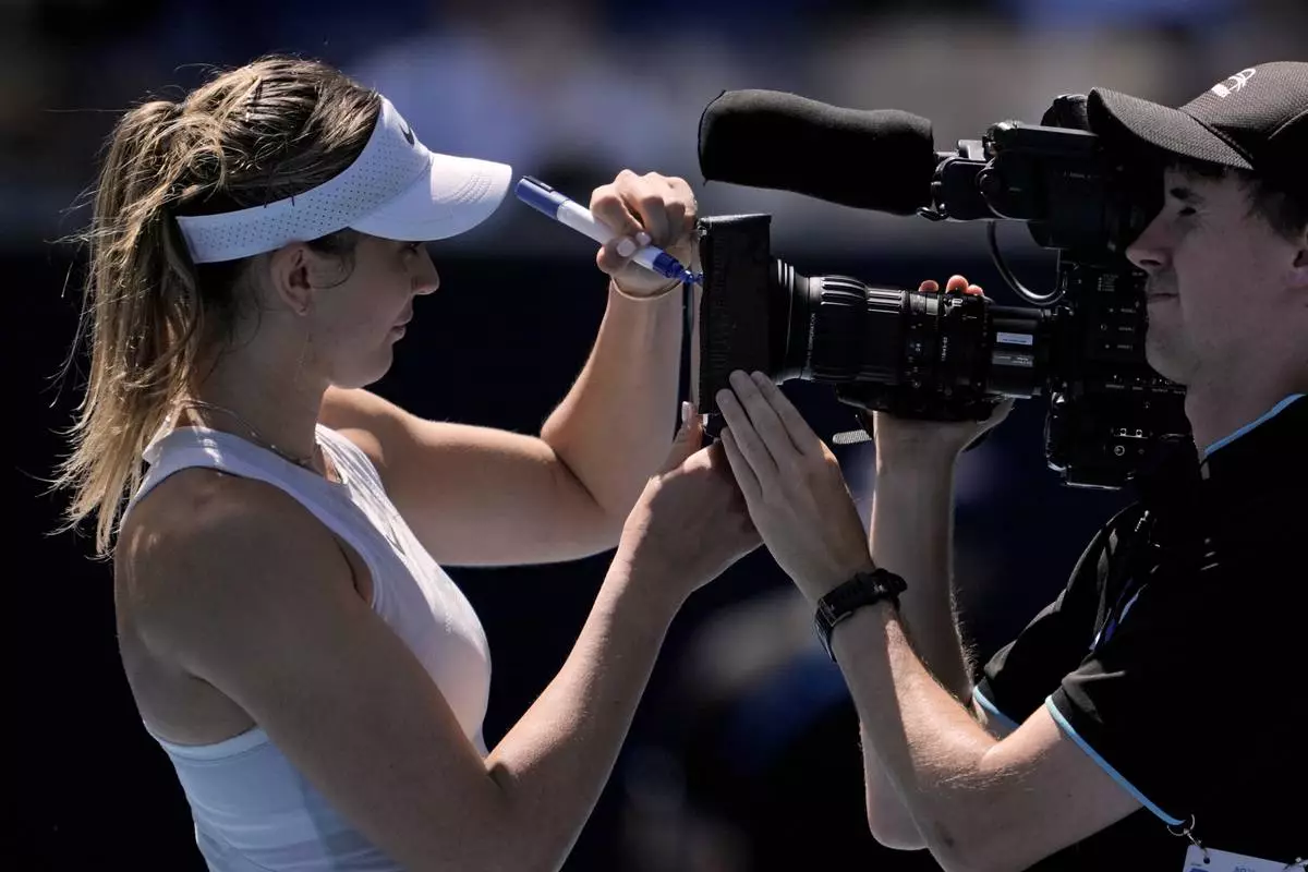 Paula Badosa of Spain autographs the screen on a television camera after defeating Marta Kostyuk of Ukraine in their third round match at the Australian Open tennis championship in Melbourne, Australia, Friday, Jan. 17, 2025. (AP Photo/Ng Han Guan)
