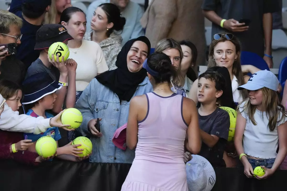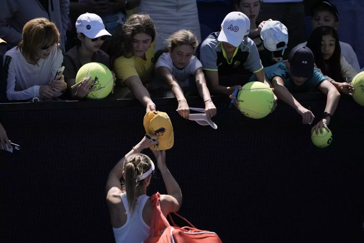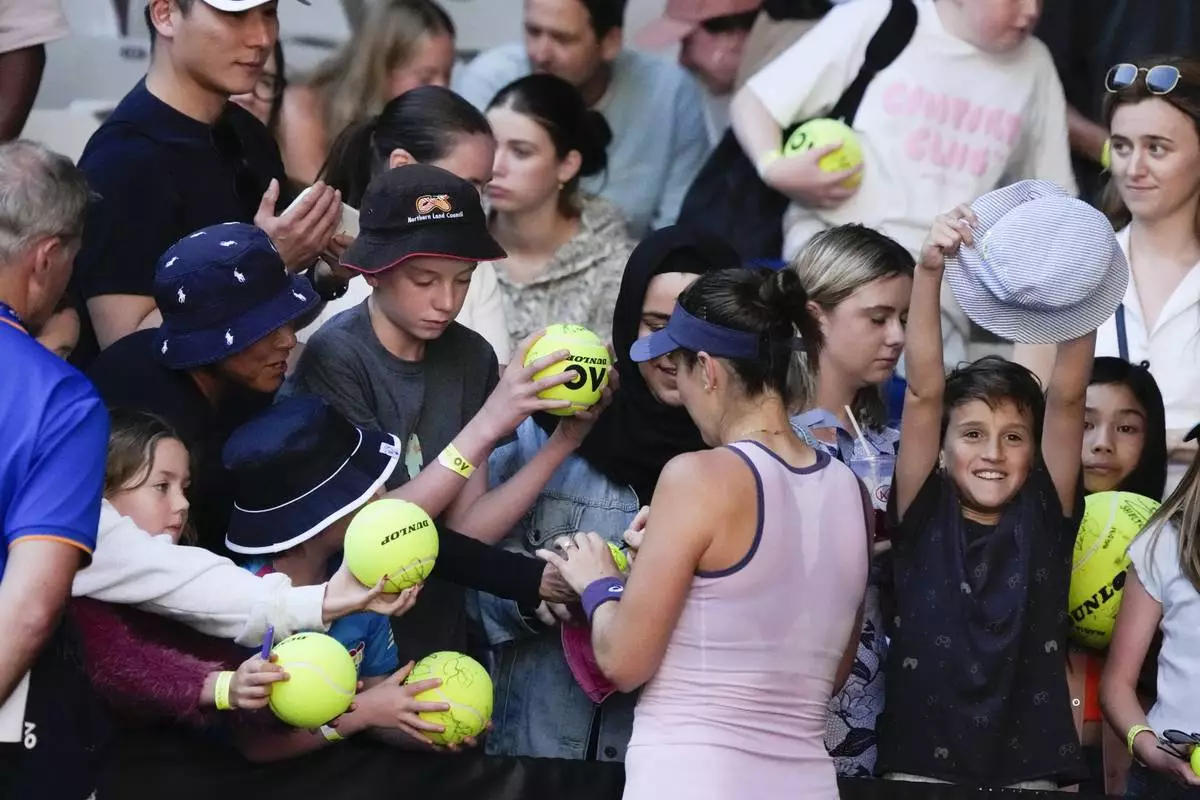 Paula Badosa of Spain signs autographs after defeating Marta Kostyuk of Ukraine in their third round match at the Australian Open tennis championship in Melbourne, Australia, Friday, Jan. 17, 2025. (AP Photo/Ng Han Guan)