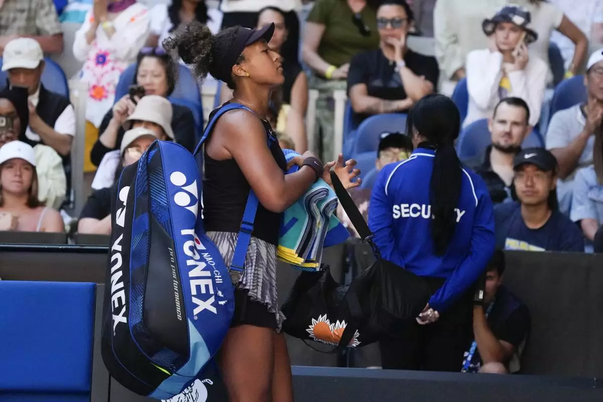 Naomi Osaka of Japan leaves the court after retiring from her third round match against Belinda Bencic of Switzerland at the Australian Open tennis championship in Melbourne, Australia, Friday, Jan. 17, 2025. (AP Photo/Manish Swarup)