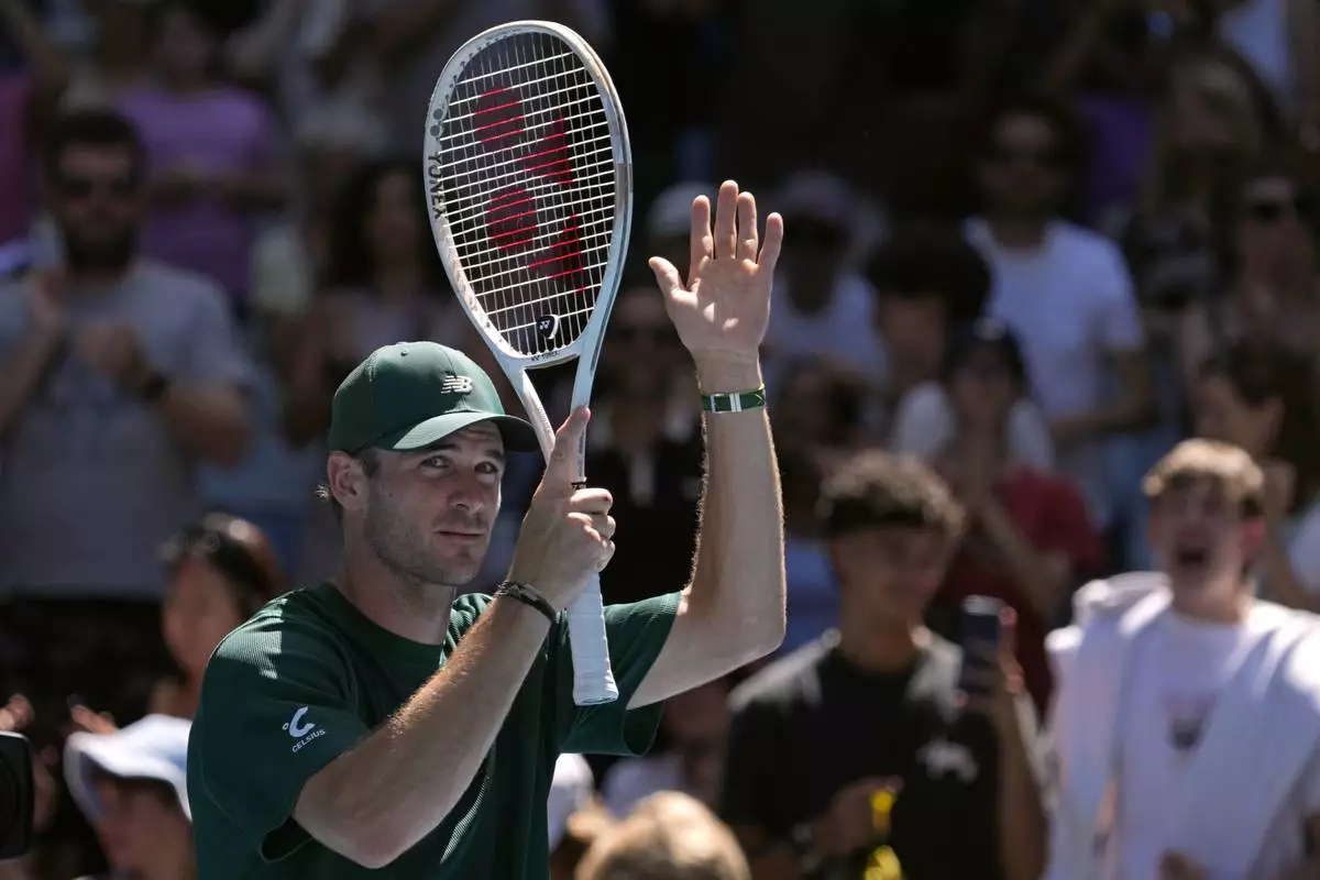 Tommy Paul of the U.S. celebrates after defeating Roberto Carballes Baena of Spain in their third round match at the Australian Open tennis championship in Melbourne, Australia, Friday, Jan. 17, 2025. (AP Photo/Manish Swarup)