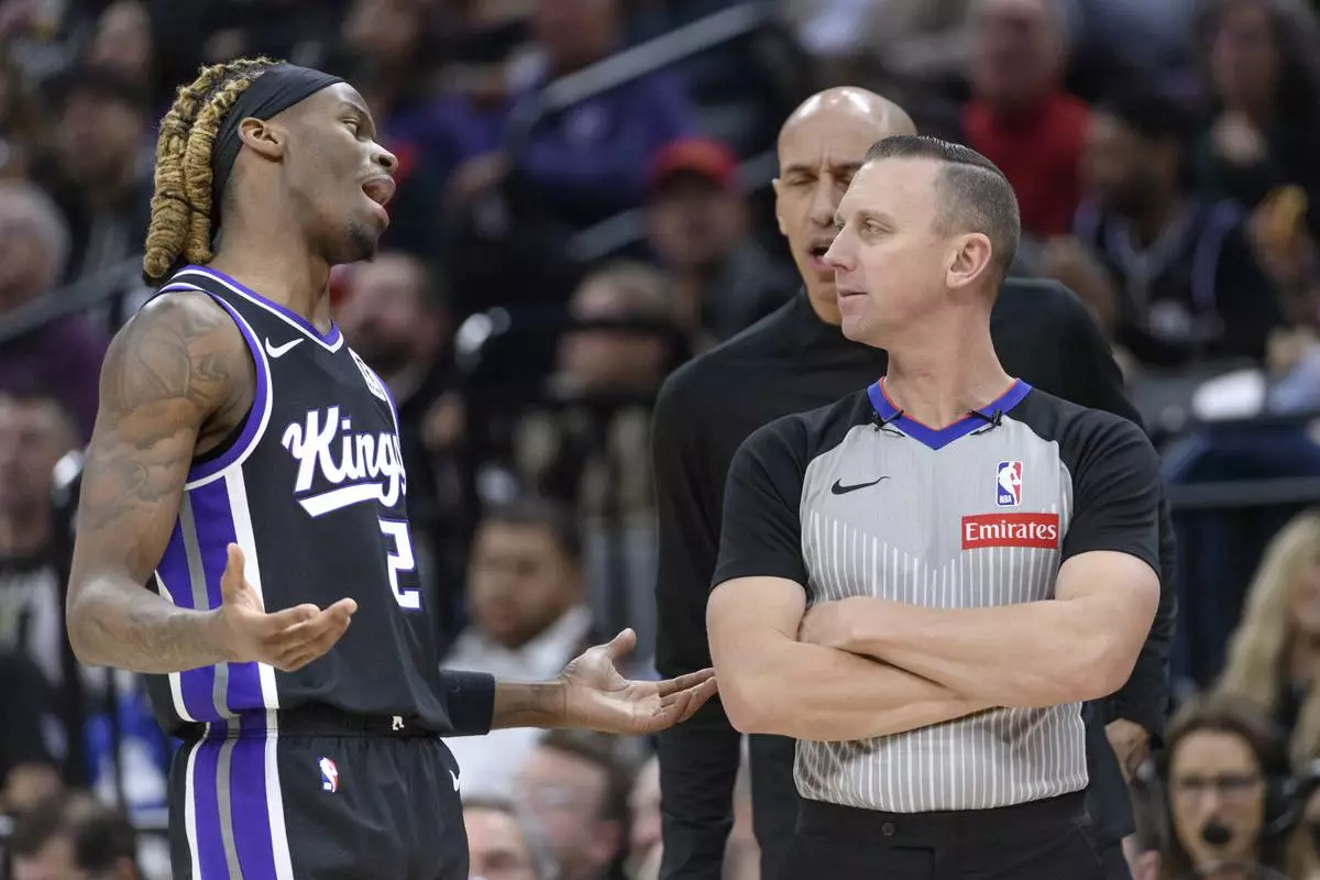 Sacramento Kings guard Keon Ellis, left, pleads with referee Justin Van Duyne, front right, after being called for a foul during the first half of an NBA basketball game against the Houston Rockets in Sacramento, Calif., Thursday, Jan. 16, 2025. (AP Photo/Randall Benton)