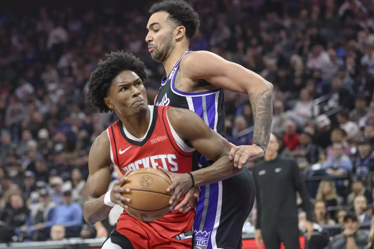 Houston Rockets forward Amen Thompson, left, drives to the basket past Sacramento Kings forward Trey Lyles, right, during the first half of an NBA basketball game in Sacramento, Calif., Thursday, Jan. 16, 2025. (AP Photo/Randall Benton)