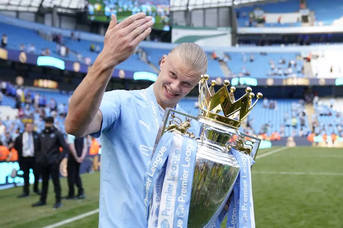 FILE -Manchester City's Erling Haaland celebrates with the Premier League trophy after the English Premier League soccer match between Manchester City and West Ham United at the Etihad Stadium in Manchester, England, May 19, 2024. (AP Photo/Dave Thompson, File)