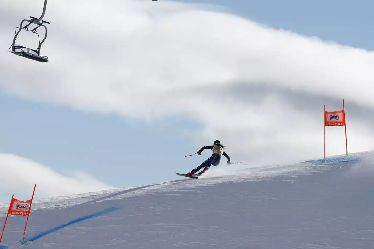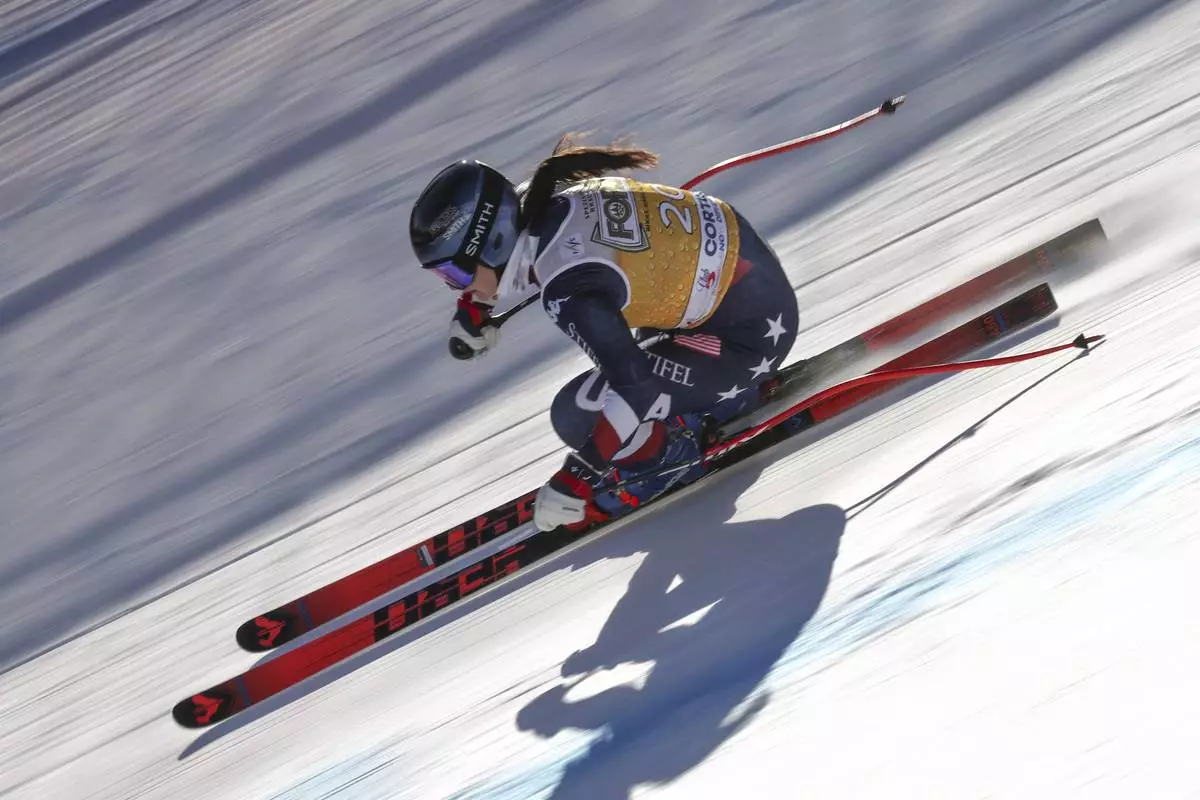 United States' Breezy Johnson speeds down the course during an alpine ski, women's World Cup downhill training, in Cortina d'Ampezzo, Italy, Friday, Jan. 17, 2025. (AP Photo/Marco Trovati)