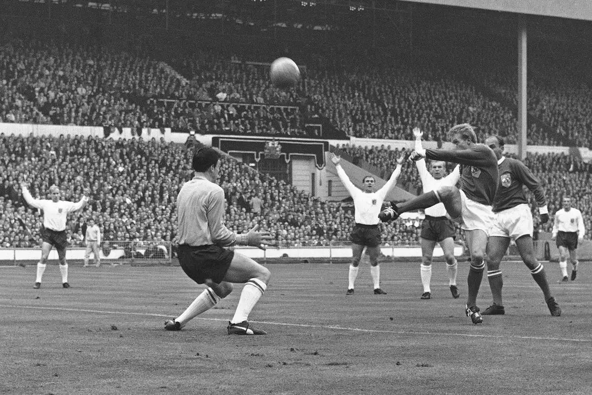 FILE - England goalkeeper Gordon Banks, left, positions himself as Scottish inside-right Denis Law takes a shot at goal during the first half of the Football Association Centenary soccer match between England and the "Rest of the World team" at Wembley Stadium in London on Oct. 23, 1963. (AP Photo/Bippa, File)