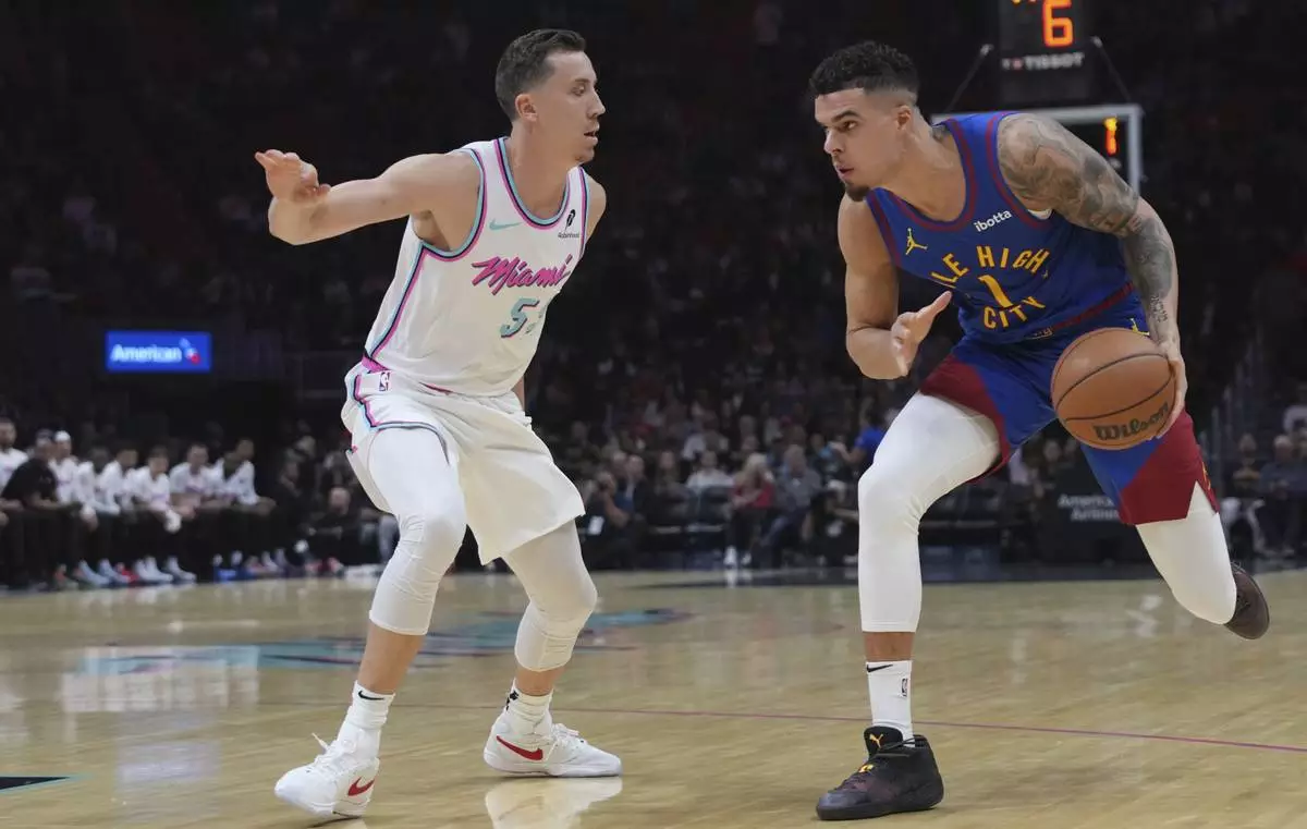 Miami Heat forward Duncan Robinson defends Denver Nuggets forward Michael Porter Jr. (1) during the first half of an NBA basketball game, Friday, Jan. 17, 2025, in Miami. (AP Photo/Lynne Sladky)