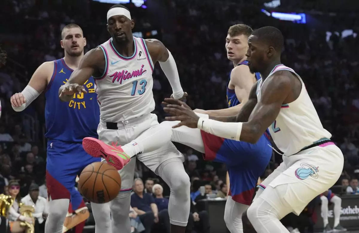 Denver Nuggets center Nikola Jokic, left, Miami Heat center Bam Adebayo (13), Nuggets guard Christian Braun, second from right, and Heat guard Terry Rozier, right, go for the ball during the first half of an NBA basketball game, Friday, Jan. 17, 2025, in Miami. (AP Photo/Lynne Sladky)