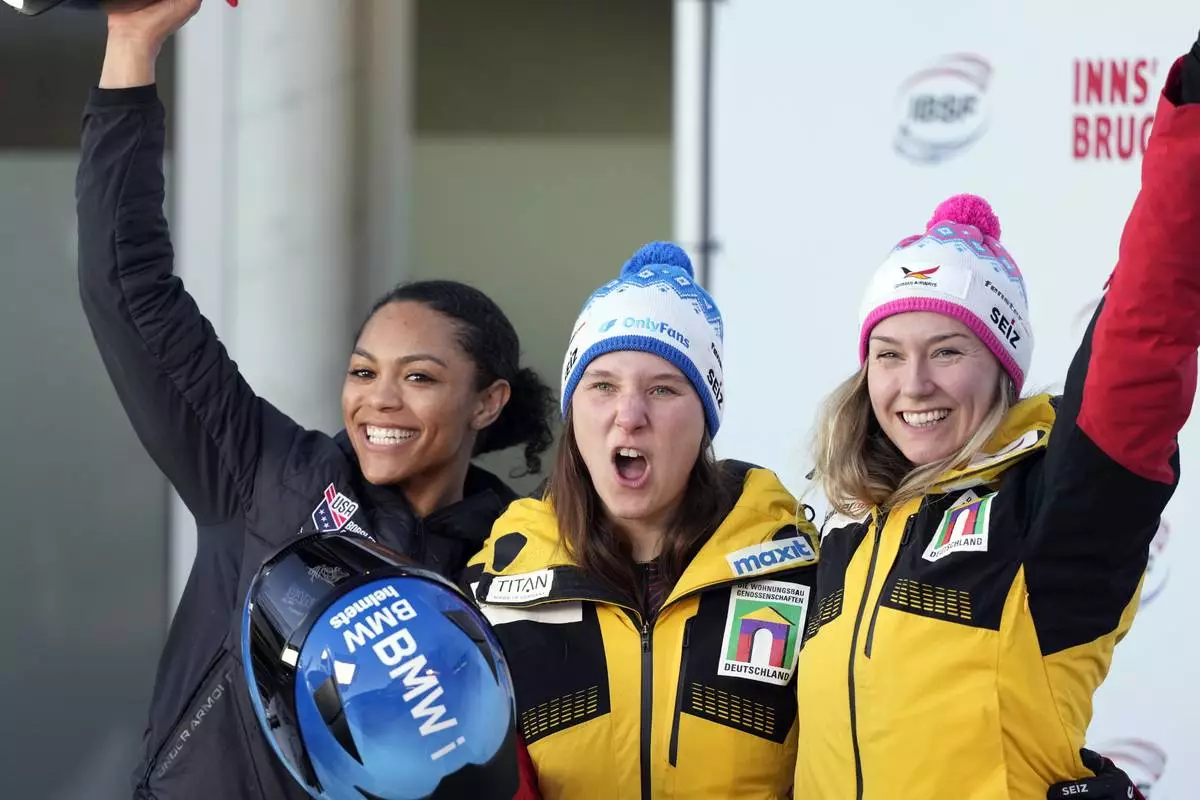 Second placed Kaysha Love, of the United States, winner Lisa Buckwitz, of Germany, and third placed Laura Nolte, of Germany, from left, pose together after competing in the women's monobob at the Bobsleigh World Cup in Innsbruck, Austria, Saturday, Jan. 18, 2025. (AP Photo/Matthias Schrader)