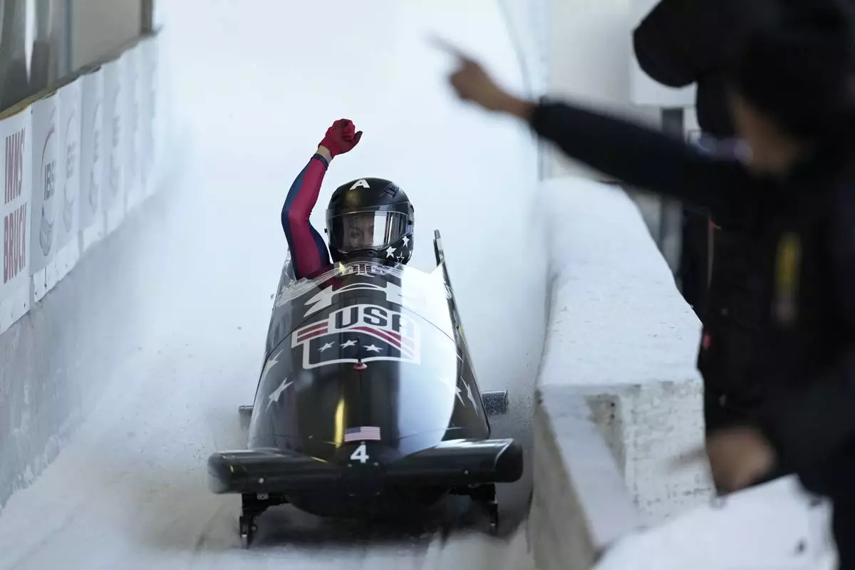 Kaysha Love, of the United States, competes in the women's monobob at the Bobsleigh World Cup in Innsbruck, Austria, Saturday, Jan. 18, 2025. (AP Photo/Matthias Schrader)