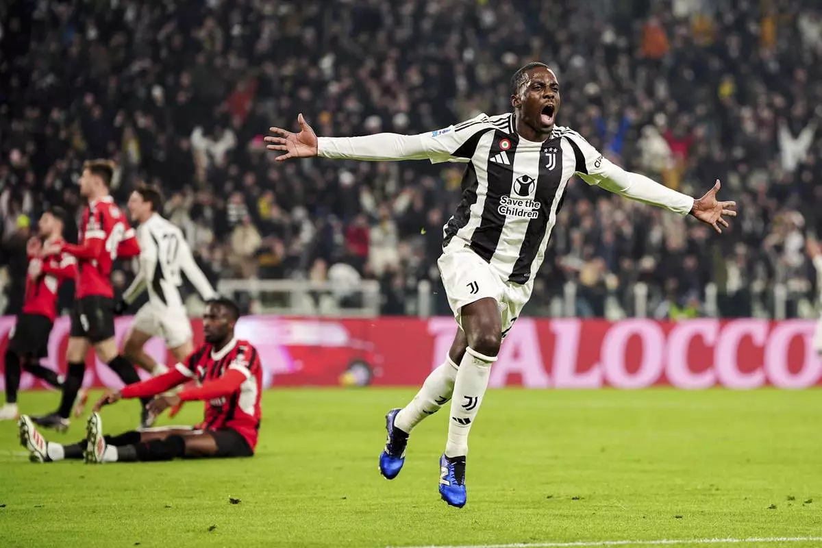 Juventus' Timothy Weah, right, scores during the Italian Serie A soccer match between Juventus and AC Milan at the Allianz Stadium in Turin, Italy, Saturday, Jan. 18, 2025. (Marco Alpozzi/LaPresse via AP)
