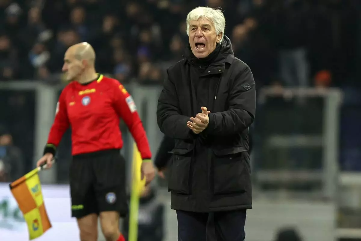 Atalanta's head coach Gian Piero Gasperini reacts during the Italian Serie A soccer match between Atalanta and Napoli at the Gewiss Stadium in Bergamo, Italy, Saturday, Jan. 18, 2025. (Stefano Nicoli/LaPresse via AP)