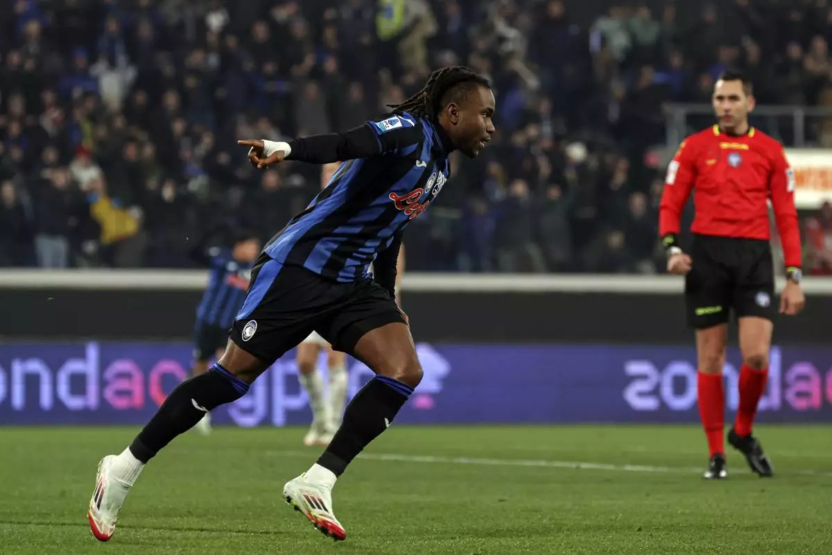Atalanta's Ademola Lookman celebrates scoring a goal during the Italian Serie A soccer match between Atalanta and Napoli at the Gewiss Stadium in Bergamo, Italy, Saturday, Jan. 18, 2025. (Stefano Nicoli/LaPresse via AP)