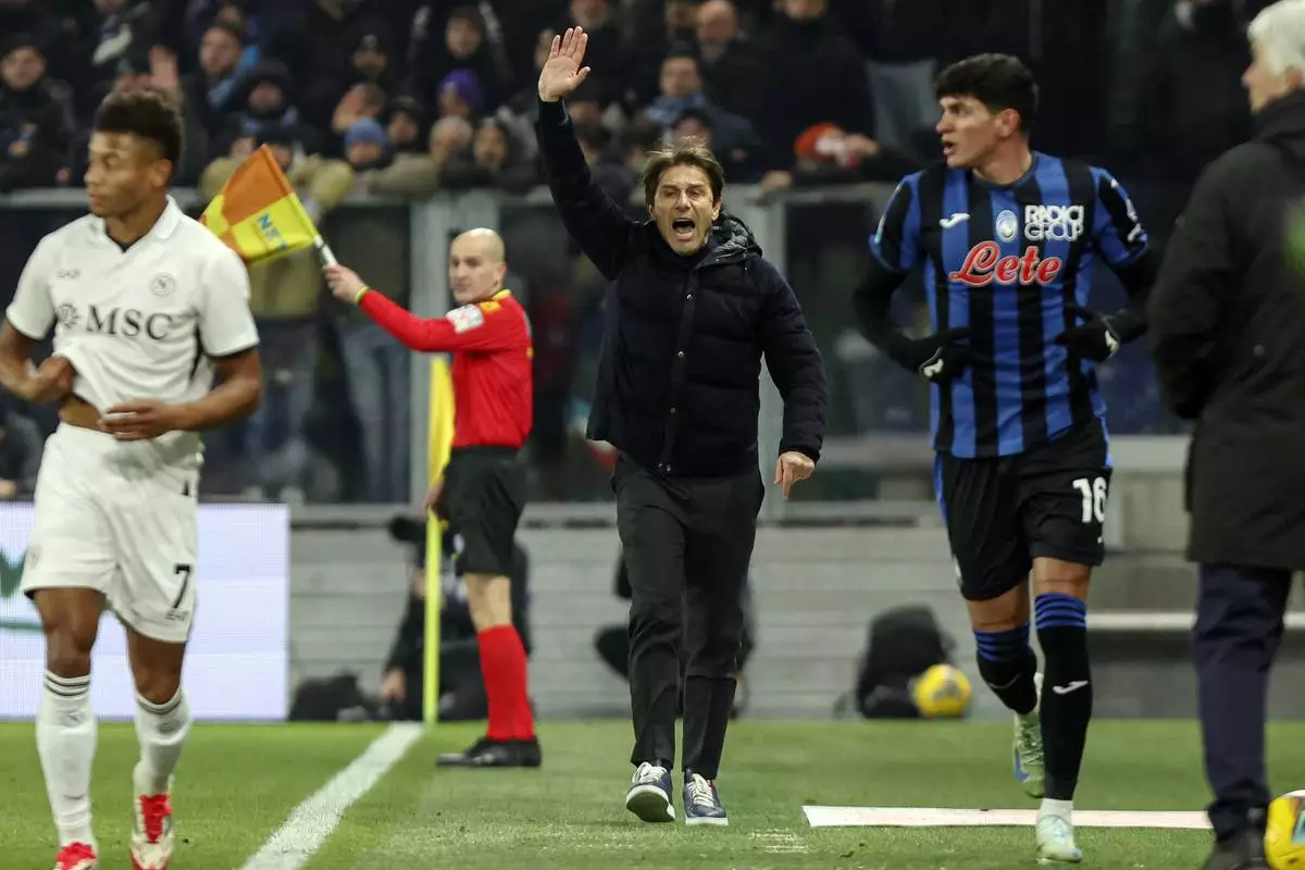 Napoli's head coach Antonio Conte reacts during the Italian Serie A soccer match between Atalanta and Napoli at the Gewiss Stadium in Bergamo, Italy, Saturday, Jan. 18, 2025. (Stefano Nicoli/LaPresse via AP)