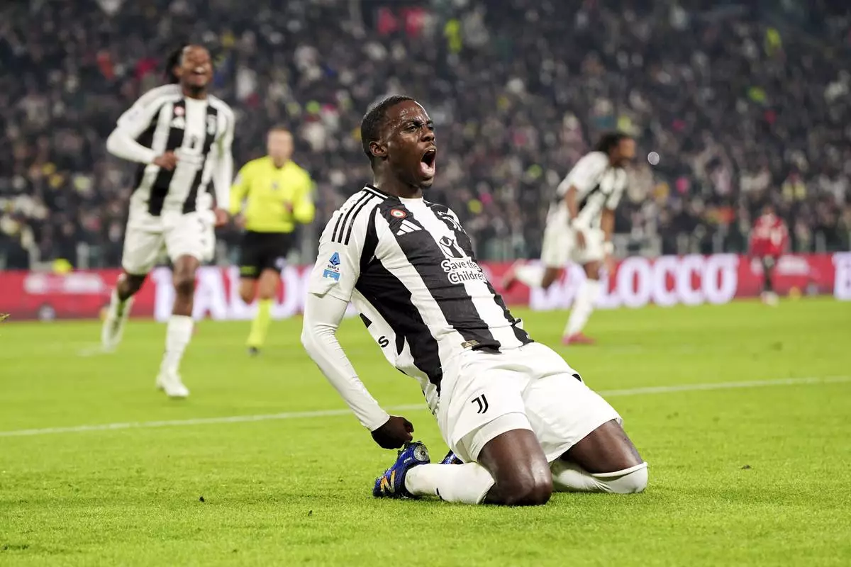 Juventus' Timothy Weah celebrates after scoring during the Italian Serie A soccer match between Juventus and AC Milan at the Allianz Stadium in Turin, Italy, Saturday, Jan. 18, 2025. (Marco Alpozzi/LaPresse via AP)