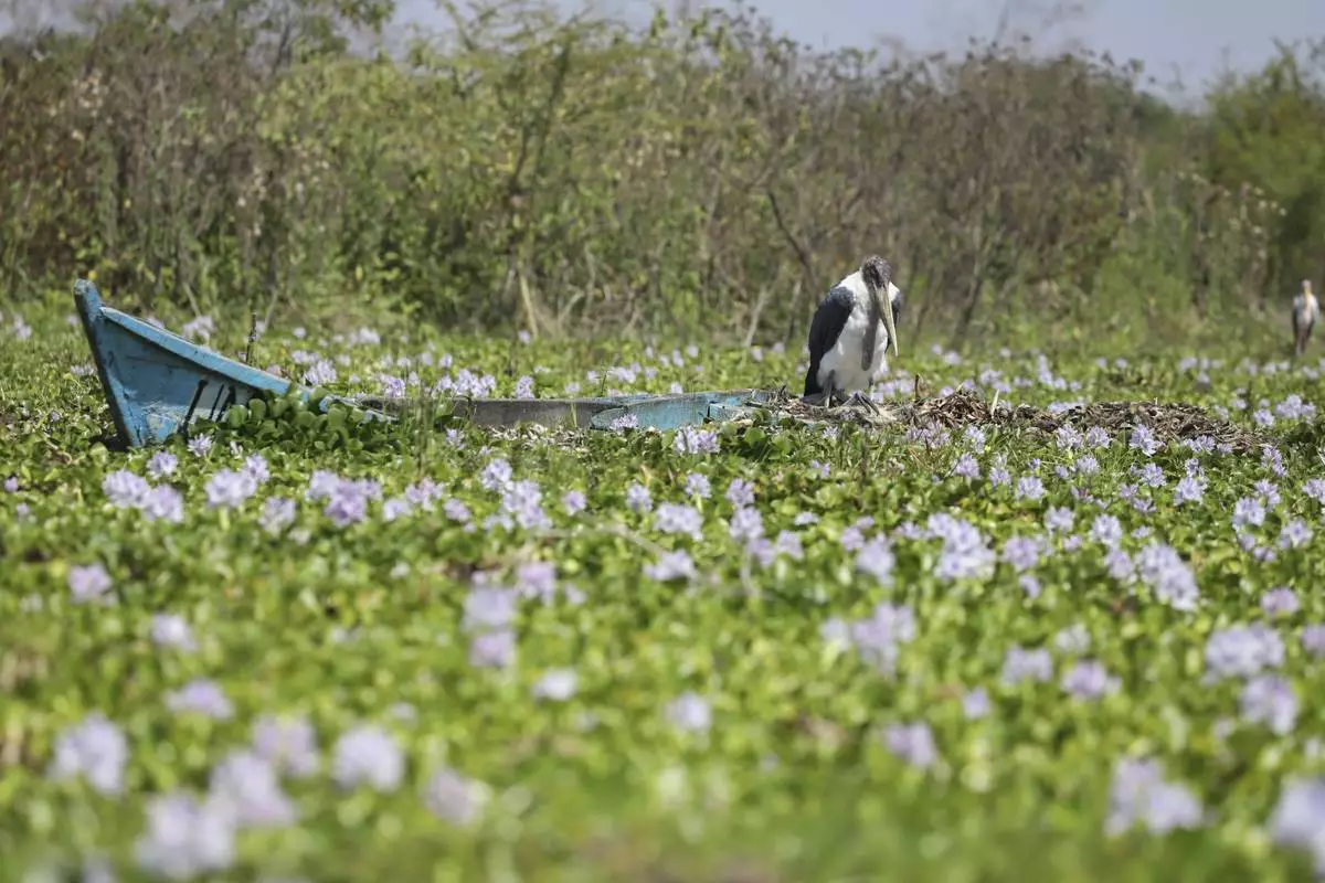 A marabou stork patches on an abandoned fishing boat trapped in hyacinth at Central Beach in Lake Naivasha in Nakuru county, Kenya's Rift Valley, Friday, Dec. 13, 2024. (AP Photo/Andrew Kasuku)