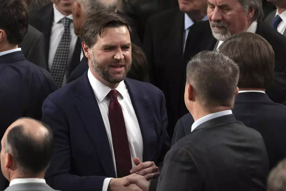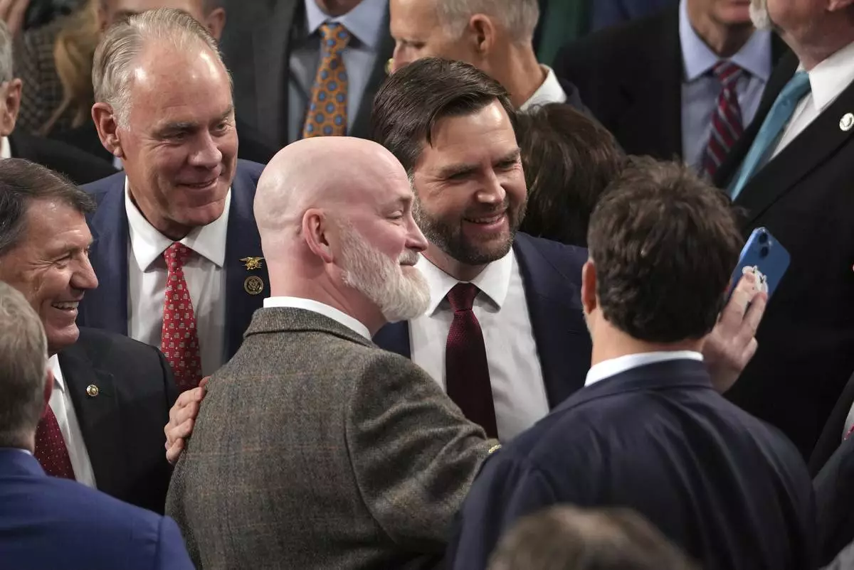 Vice President-elect JD Vance is congratulated after a joint session of Congress confirmed the Electoral College votes, affirming President-elect Donald Trump's victory in the presidential election, Monday, Jan. 6, 2025, at the U.S. Capitol in Washington. (AP Photo/Matt Rourke)