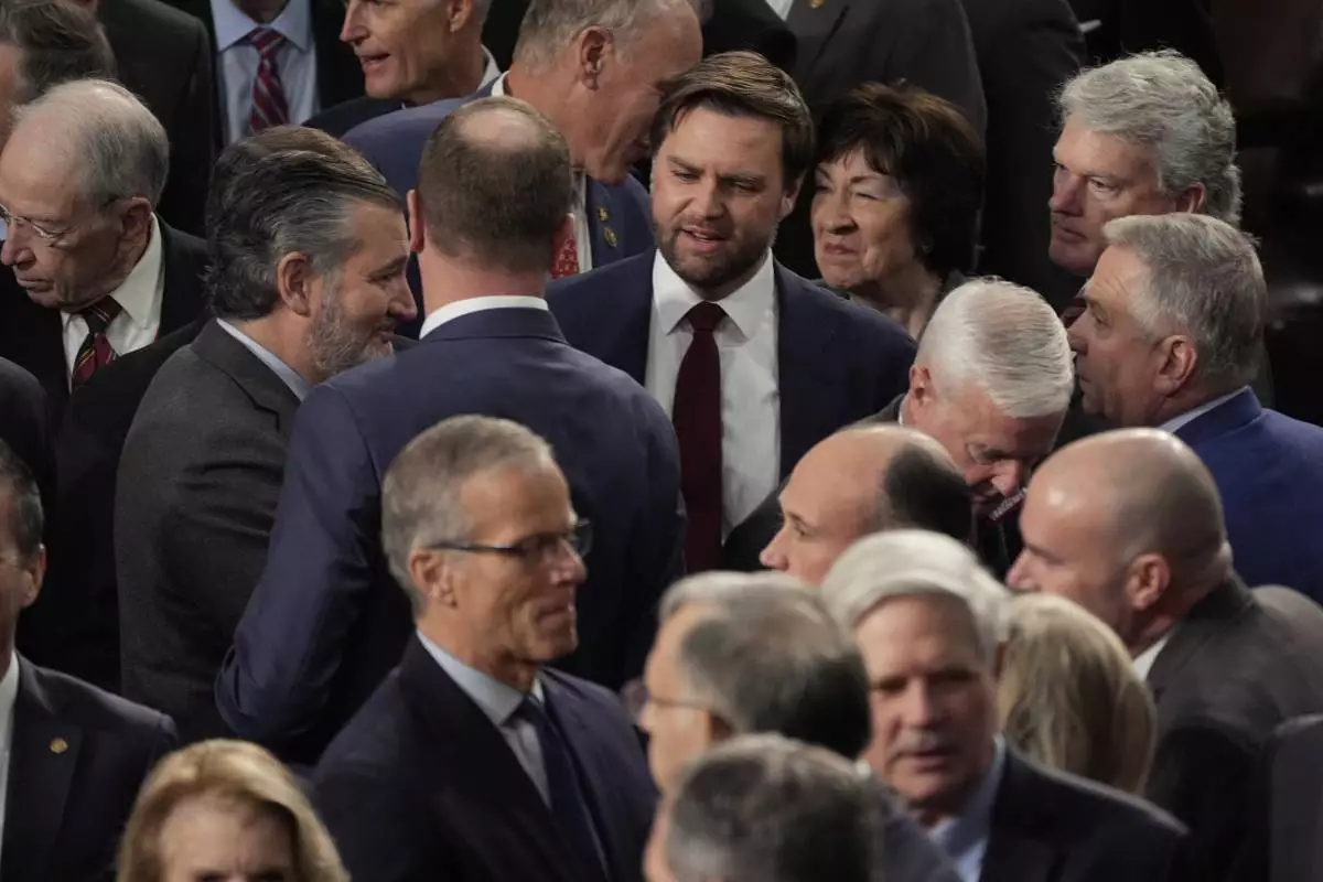 Republicans congratulate Vice President-elect JD Vance after a joint session of Congress convened to confirm the Electoral College votes, affirming President-elect Donald Trump's victory in the presidential election, Monday, Jan. 6, 2025, at the U.S. Capitol in Washington. (AP Photo/Manuel Balce Ceneta)