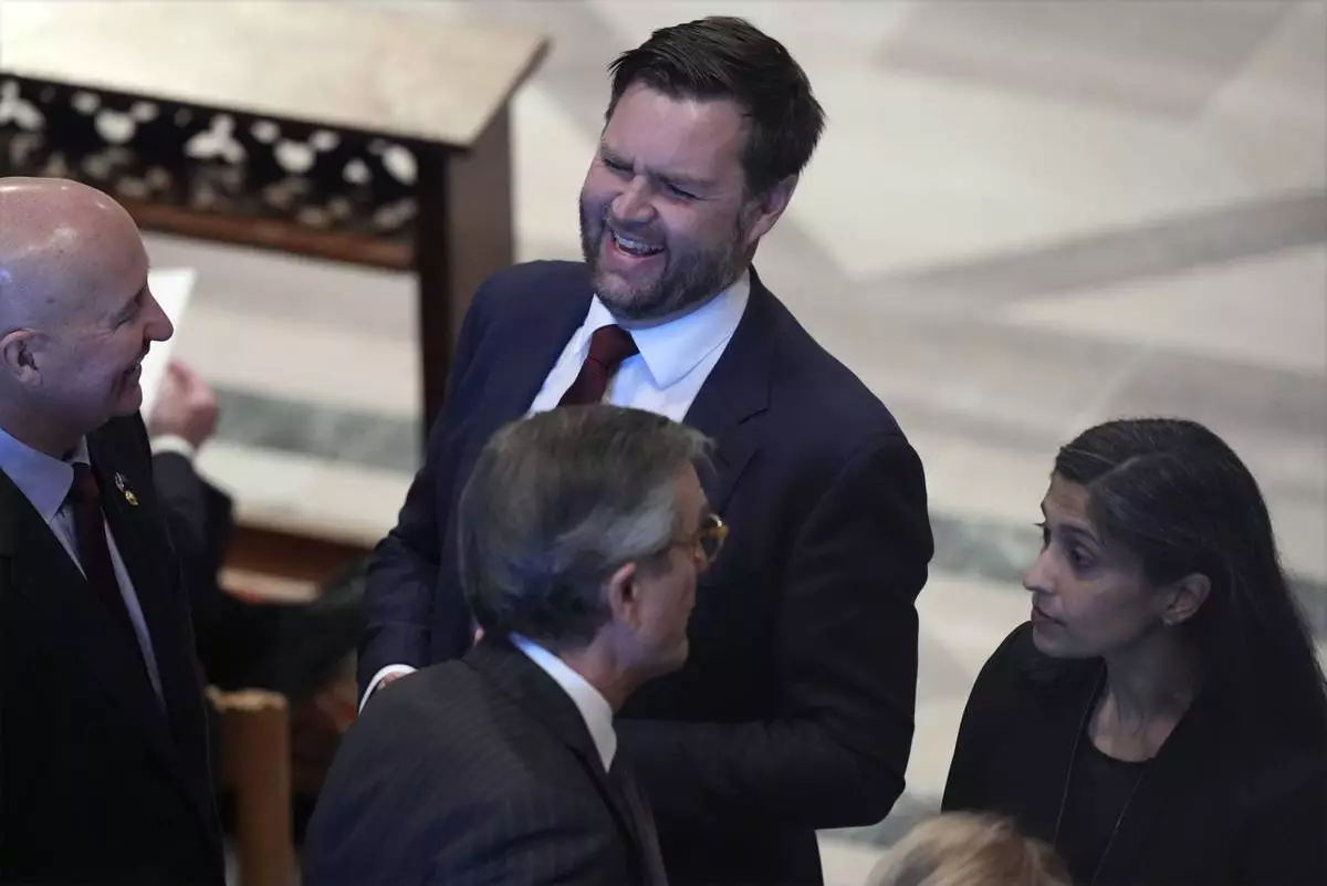 Vice President-elect JD Vance and his wife Usha Vance arrive before the state funeral for former President Jimmy Carter at Washington National Cathedral in Washington, Thursday, Jan. 9, 2025. (AP Photo/Jacquelyn Martin)