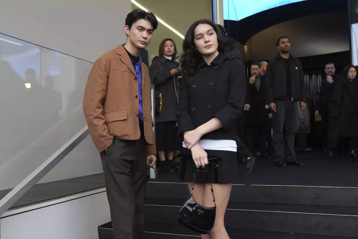 William Gao and Olivia Hardy arrive as they attend at the men's Prada Fall-Winter 2025-2026 collection show, that was presented in Milan, Italy, Sunday, Jan. 19, 2025. (AP Photo/Antonio Calanni)