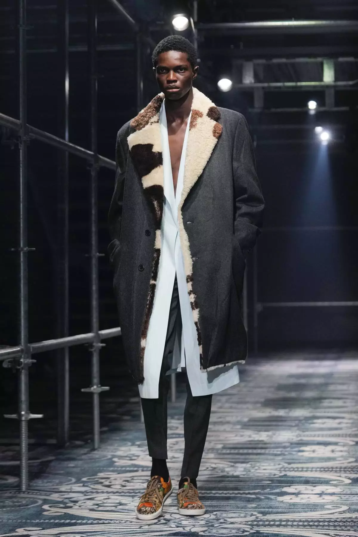 The ever-transforming showroom inside the Prada Foundation’s Deposito contemporary art space was sheathed in Art Noveau carpet, and the runway was set on raised metal scaffolding. Simons said it represented contrasts, decoration and a work-in-progress.