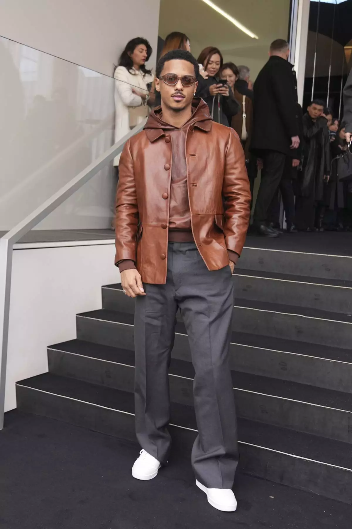 Prada's front row hailed from across the globe and disciplines, including British actor and musician William Gao, arriving with British musician Olivia Hardy, U.S. actor Keith Powers, South Korean actress Kim Tae-ri, Chinese table tennis player Ma Long and British actor Louis Patridge. A crowd of fans waited just beyond a barricade to cheer them all.