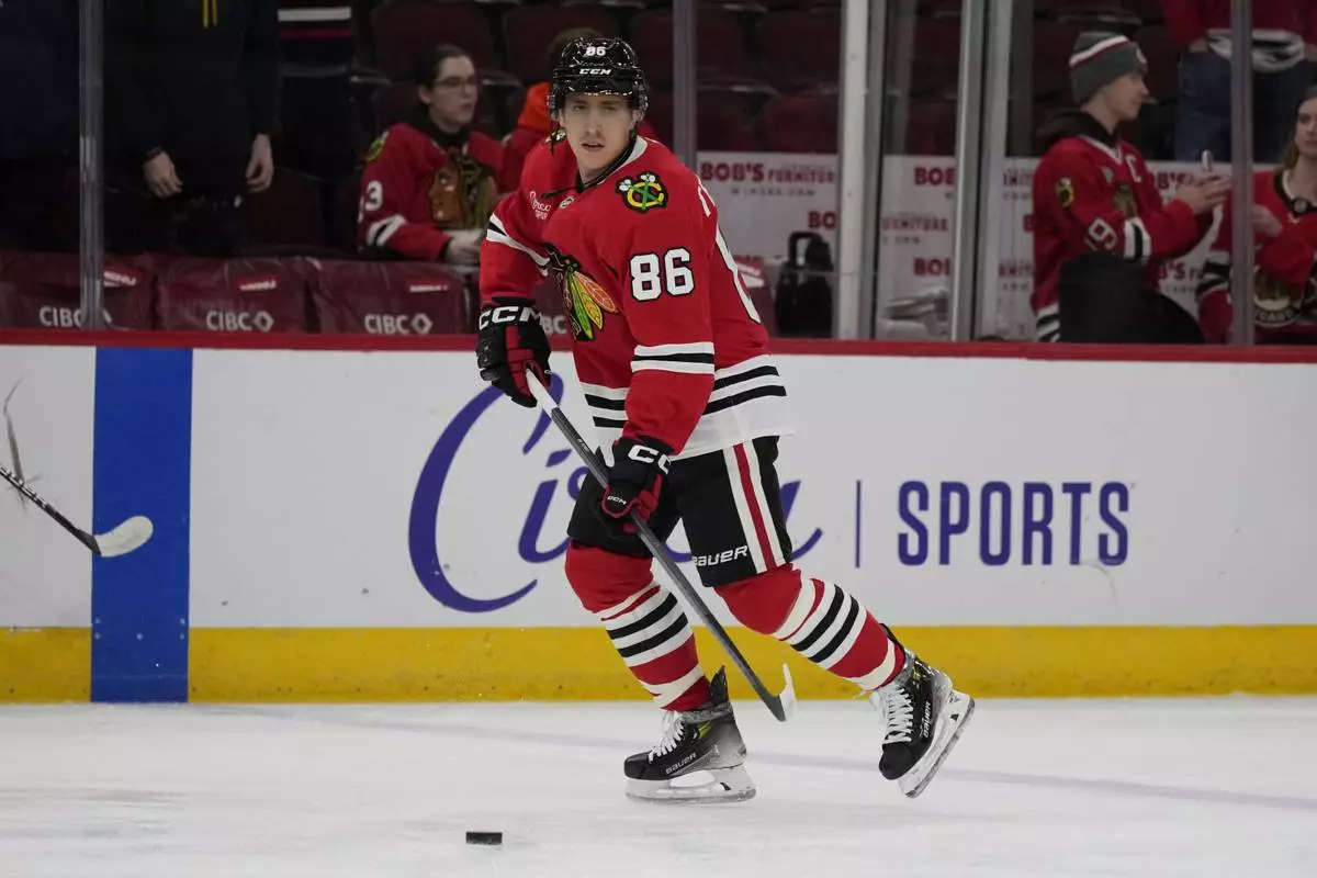 Chicago Blackhawks center Teuvo Teravainen (86) warms up before an NHL hockey game against the Carolina Hurricanes in Chicago, Monday, Jan. 20, 2025. (AP Photo/Nam Y. Huh)
