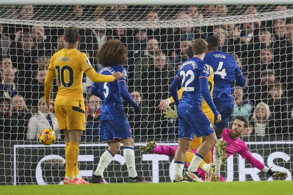 Chelsea's Tosin Adarabioyo, second right, scores the opening goal during the English Premier League soccer match between Chelsea and Wolverhampton at Stamford Bridge stadium in London, Monday, Jan. 20, 2025. (AP Photo/Kin Cheung)
