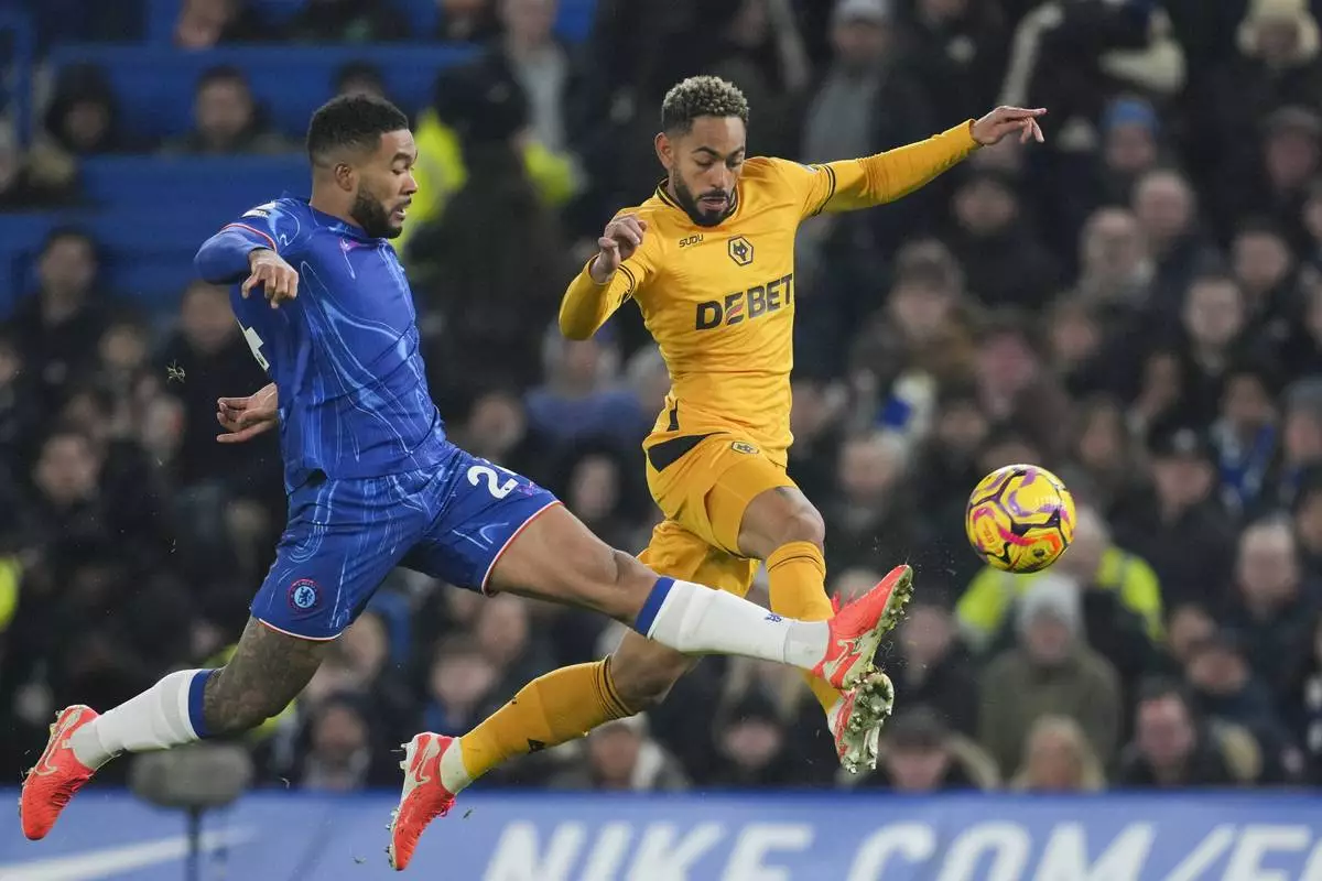 Chelsea's Reece James, left, duels for the ball with Wolverhampton Wanderers' Matheus Cunha during the English Premier League soccer match between Chelsea and Wolverhampton at Stamford Bridge stadium in London, Monday, Jan. 20, 2025. (AP Photo/Kin Cheung)