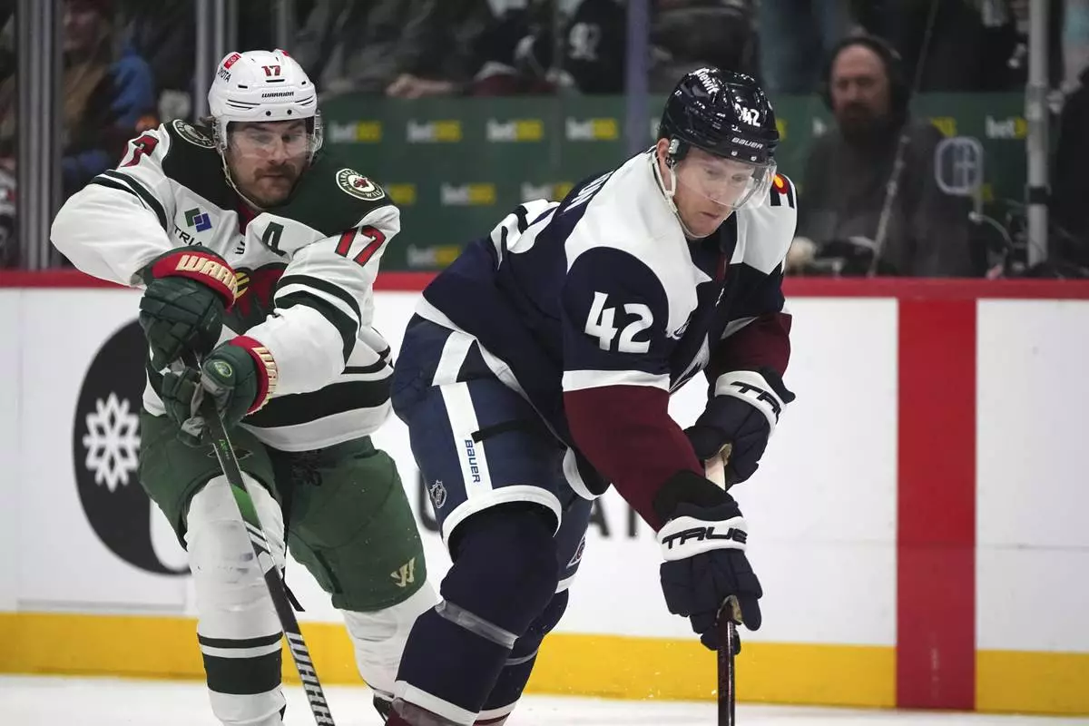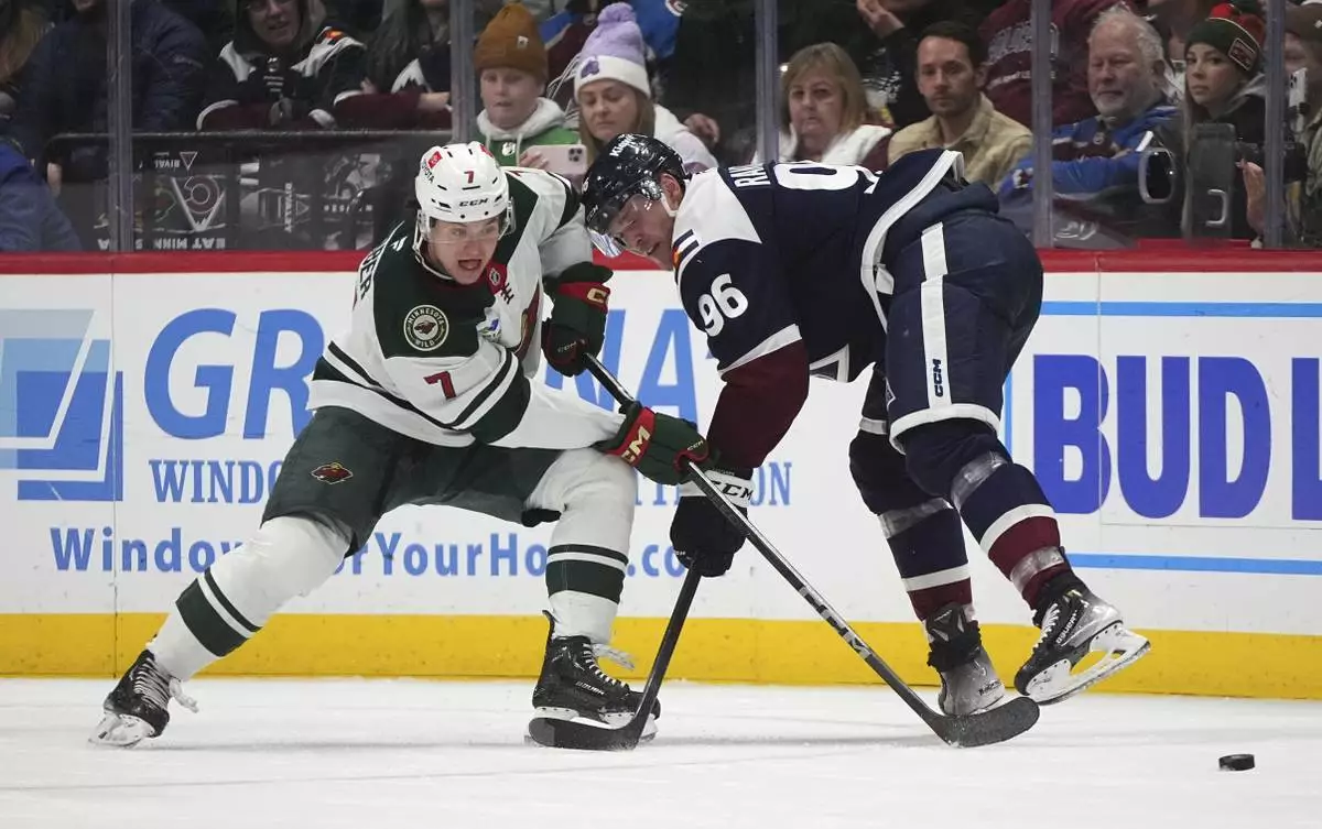 Minnesota Wild defenseman Brock Faber, left, knocks the puck away from Colorado Avalanche right wing Mikko Rantanen, right, in the second period of an NHL hockey game Monday, Jan. 20, 2025, in Denver. (AP Photo/David Zalubowski)
