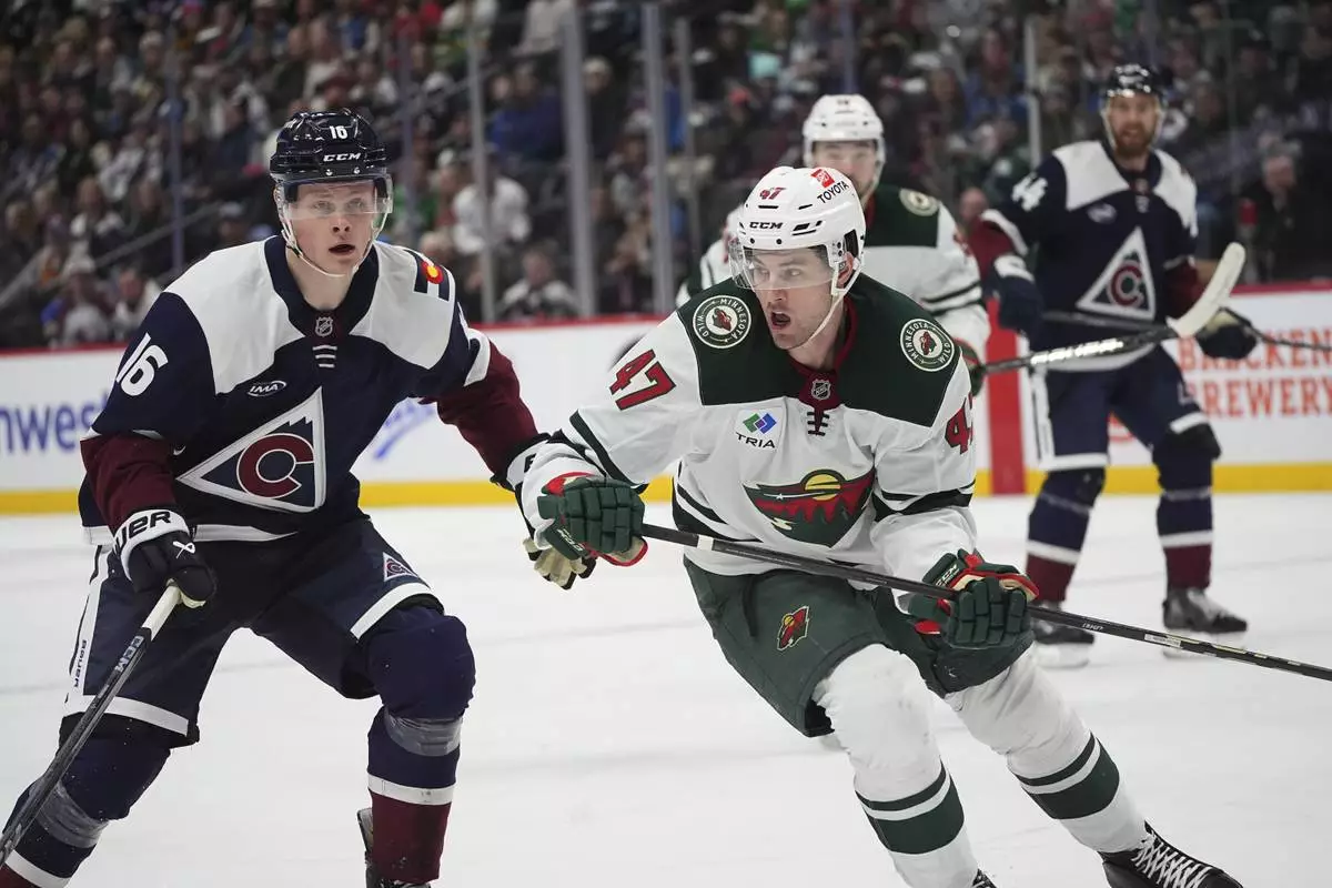Minnesota Wild defenseman Declan Chisholm, right, pursues the puck with Colorado Avalanche center Juuso Parssinen in the first period of an NHL hockey game Monday, Jan. 20, 2025, in Denver. (AP Photo/David Zalubowski)